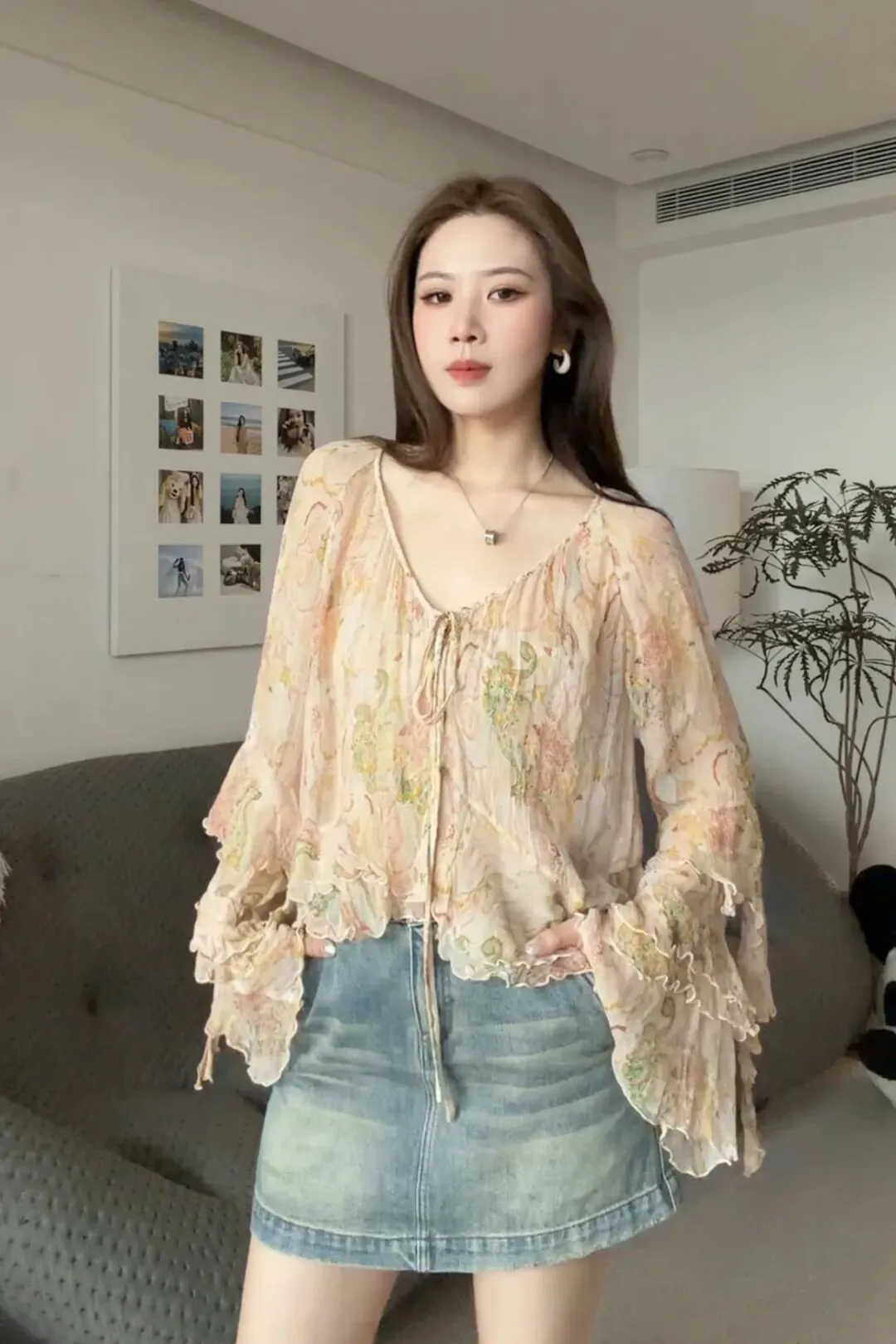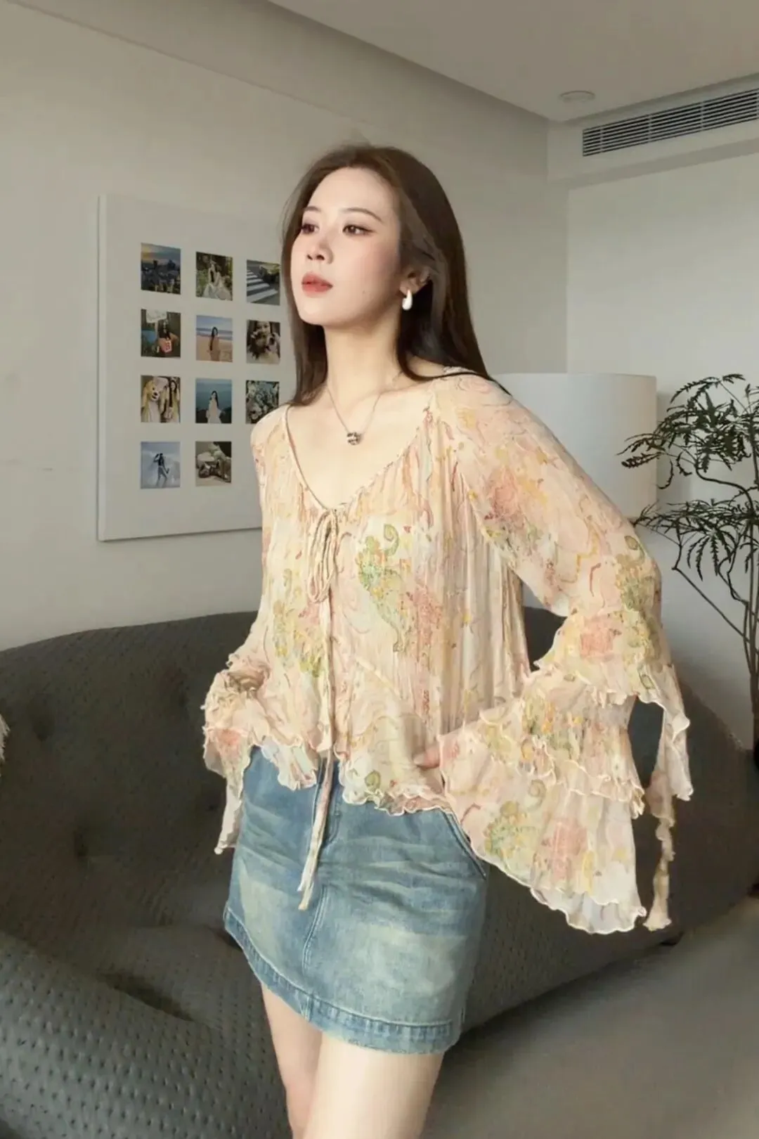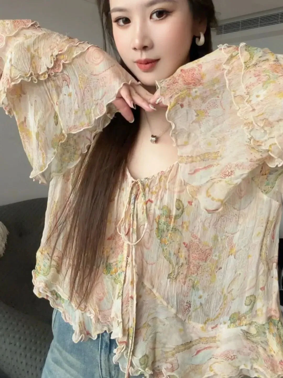 下摆也是做了一点小荷叶边的感觉,整个上身就是很有空气感、很轻盈。