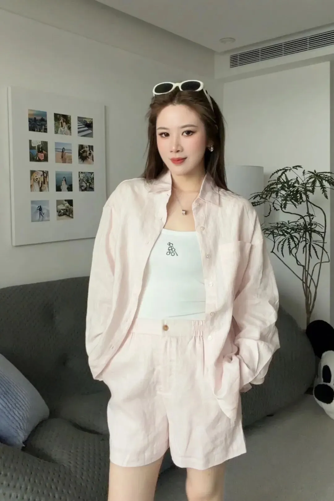 这件是一个亚麻的套装,淡粉色的。这个粉非常嫩、非常浅,可以一套穿,或者把它拆开穿。