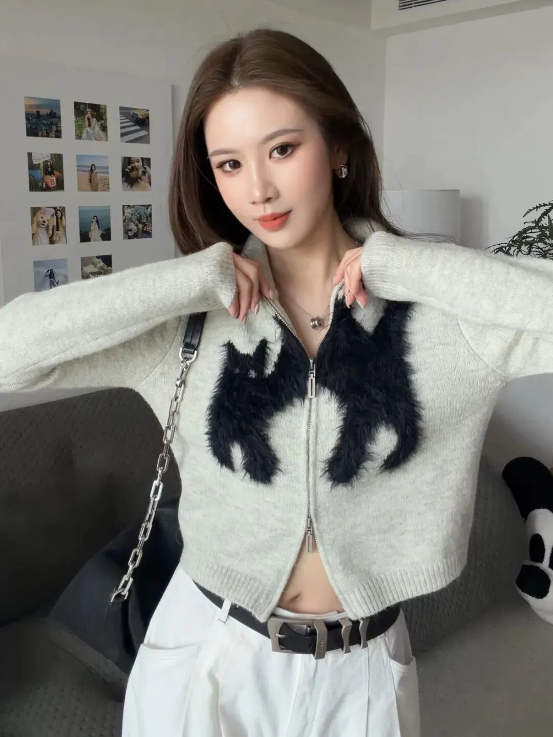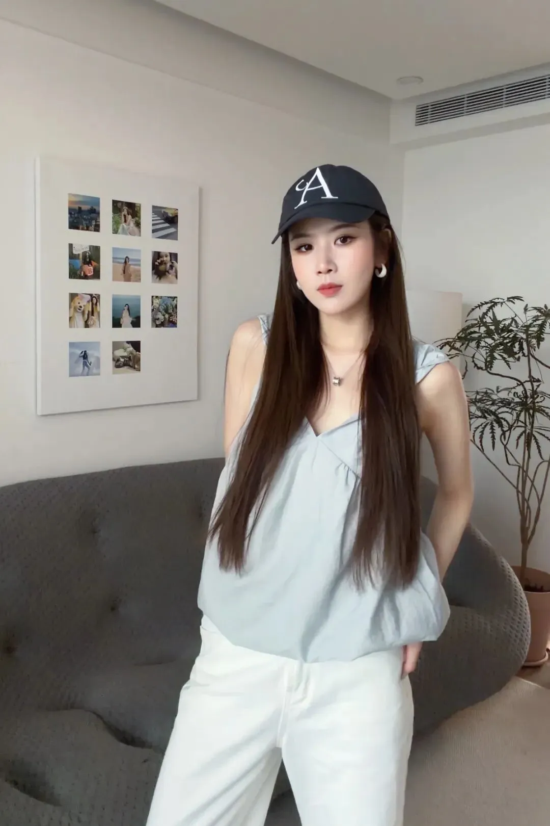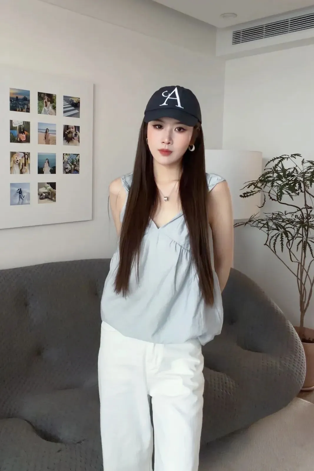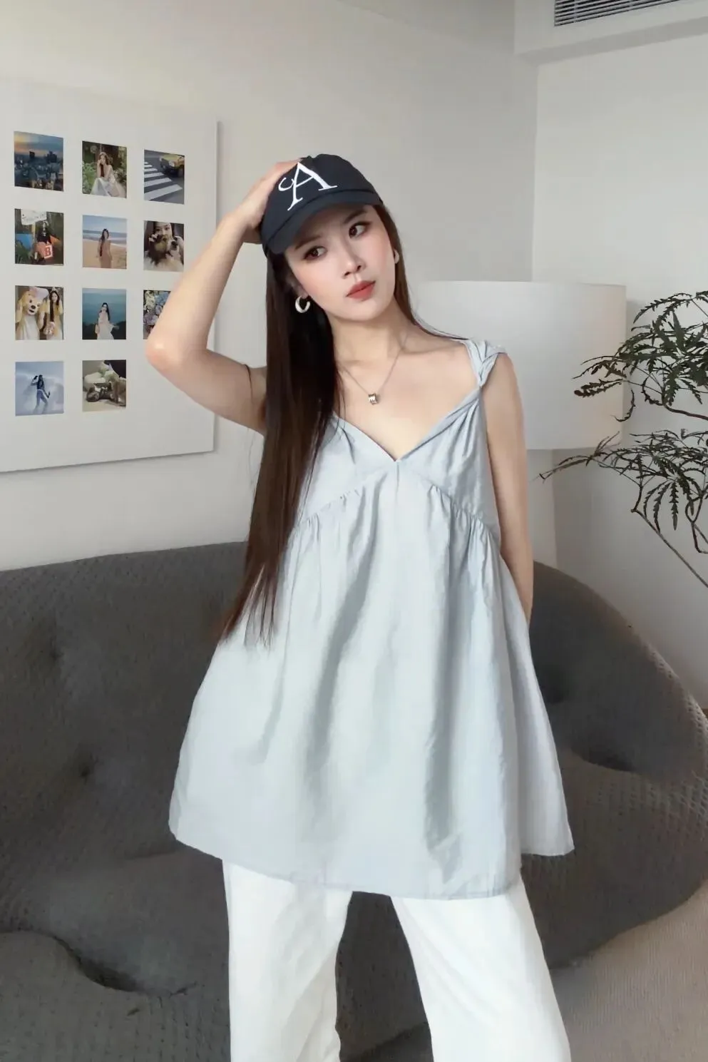确实它可以搭配很多种不同的感觉、不同的风格。可以搭配白色半裙,就比较俏皮一点;或者跟我一样,搭一个白色长裤,用棒球帽中和掉它这种比较俏皮可爱的感觉。