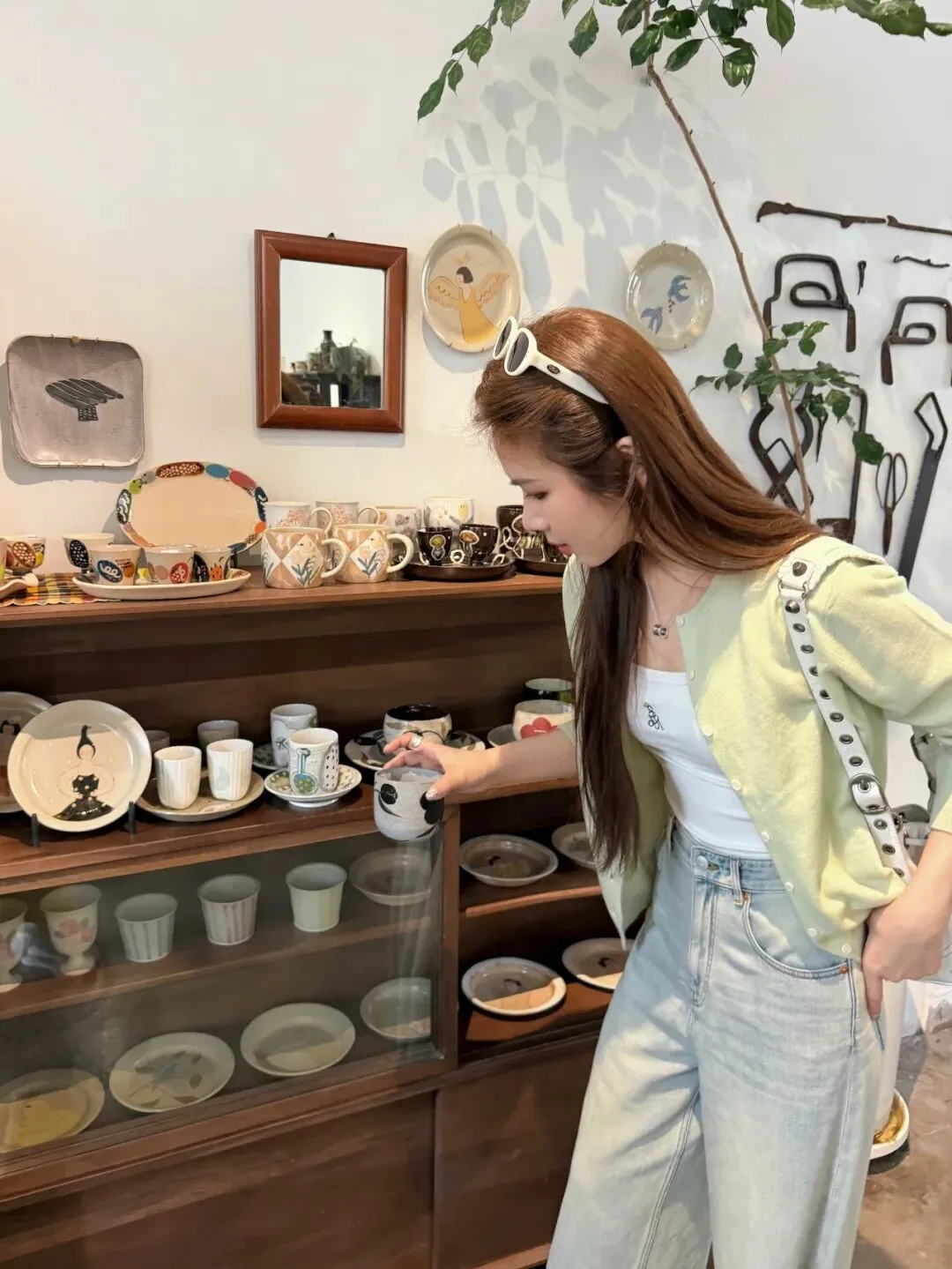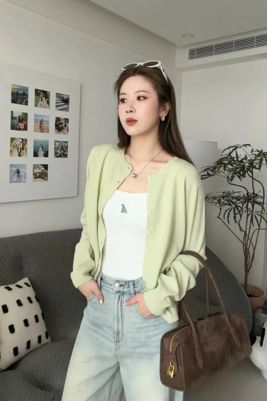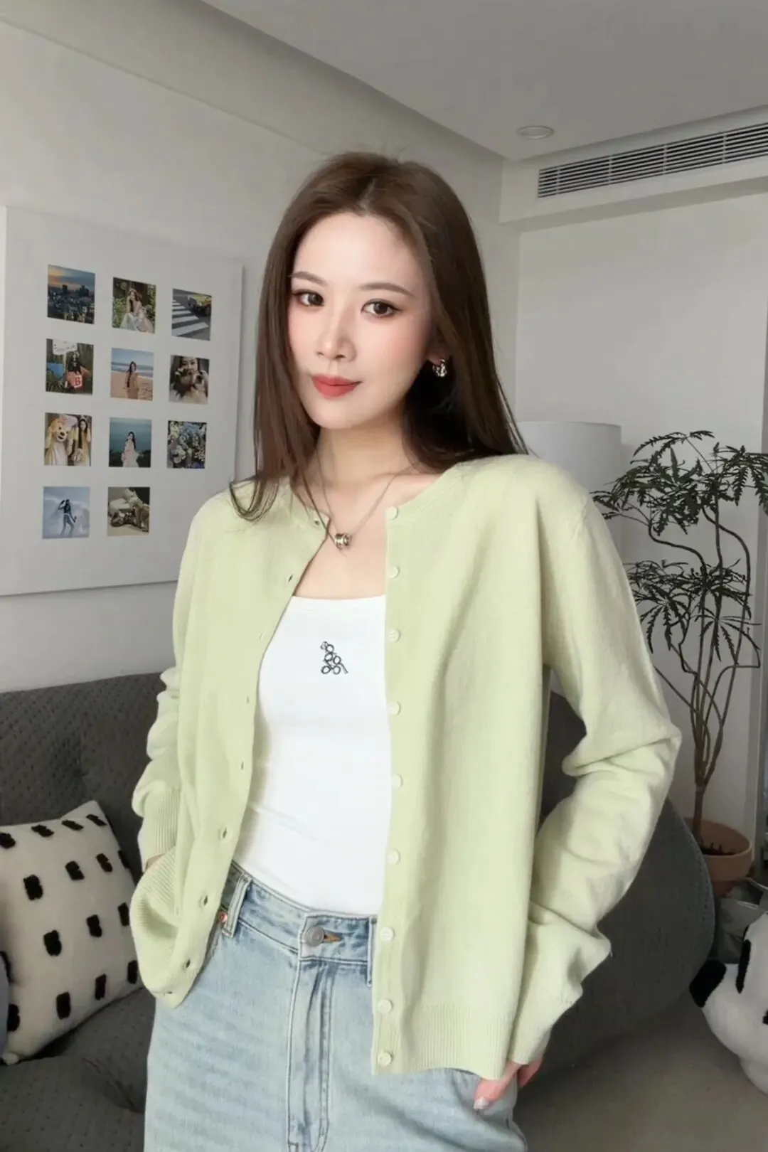 一个牛油果绿的针织,颜色巨好看。它这个牛油果里面最浅的绿,非常春天,很适合淡人。但它这个颜色又很有春天的感觉,很简单的用牛仔裤的蓝色去搭,就很好看了。