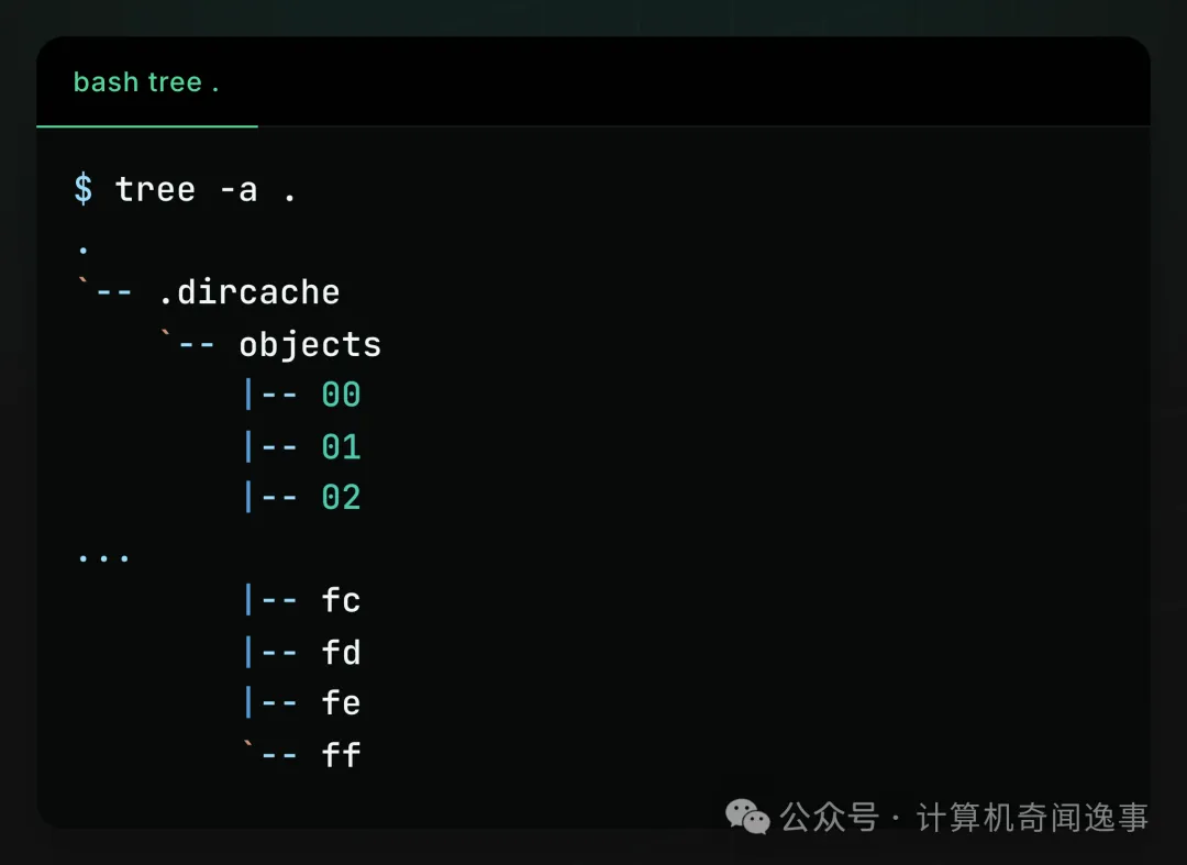 试着运行一下就会发现,该命令的功能非常单一,类似现在的 git init,仅仅是先在当前目录中创建一个隐藏目录 .dircache,然后在里面创建 objects 目录,以及以两位十六进制数命名、名称依次为 00~ ff 的 256 个子目录。