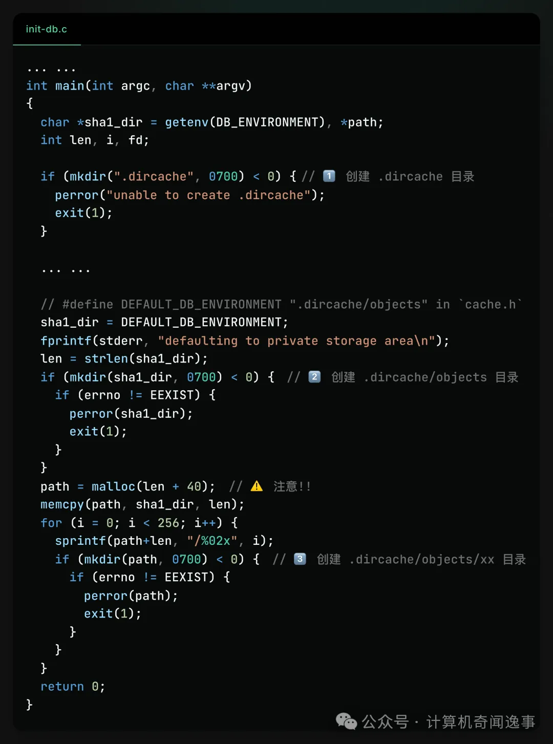 对照着功能再来欣赏下 Linus 亲自操刀的 init-db.c 的代码,