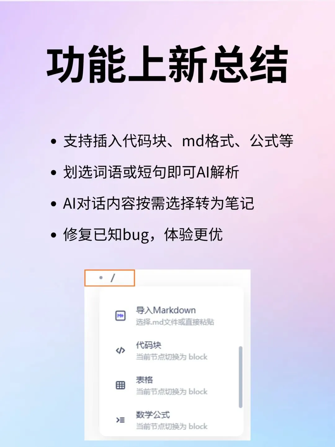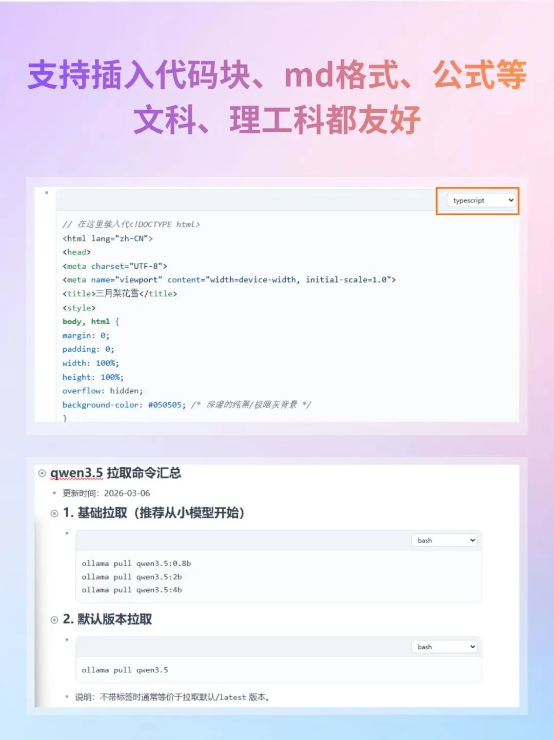 💻支持多种格式插入支持插入代码块、Markdown 、公式、表格等,文科理工科都适用
