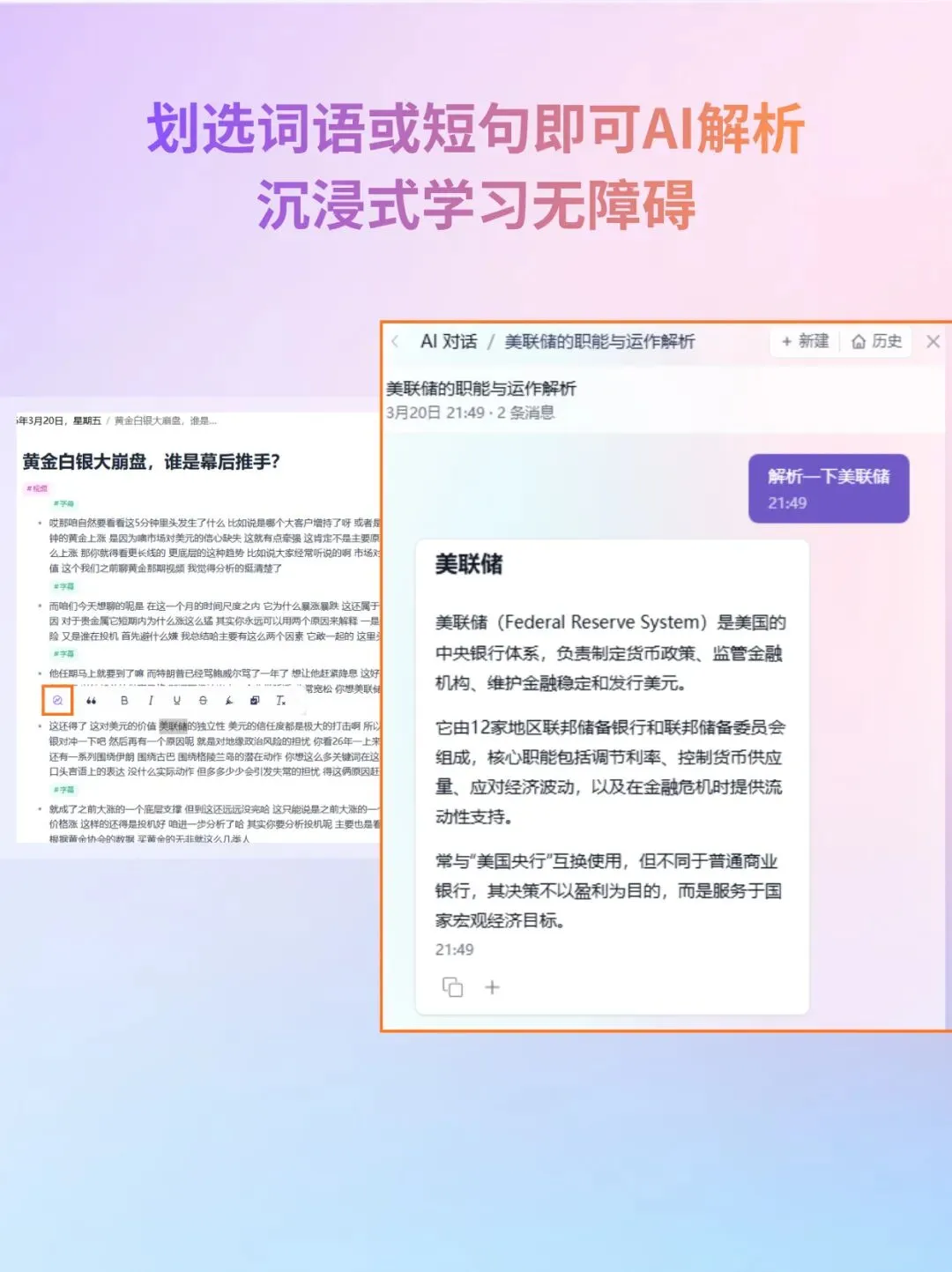 🔍 划选即可解析阅读时选中困惑的词语或短句,AI 一键你深度拆解,点对点扫清知识盲区,学习更高效