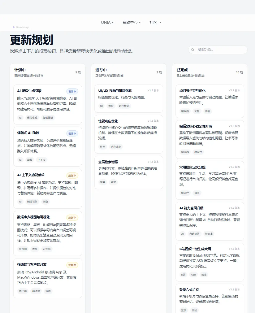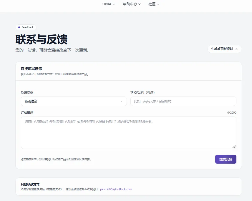 更新规划在官网—社区—更新规划都有显示,有任何意见或者反馈欢迎在群内或者UNIA官网—社区—联系我们进行反馈