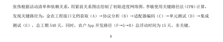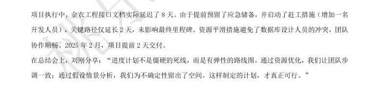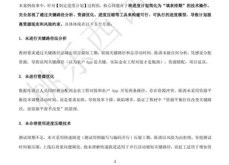 2023年9月,项目执行到第三个月,问题集中爆发。由于没有进行关键路径分析,团队一直以为农户App开发是关键路径,投入了大量资源,实际上金农工程对接才是真正的瓶颈——它受外部接口文档制约,一旦延迟,整个项目都会延误。数据库设计人员确实无法同时支撑两个活动,加班导致效率下降、缺陷增多。测试阶段果然发现时间不足,不得不压缩测试,导致上线后质量问题频发。