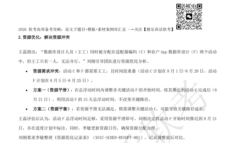 架构师张伟发现,金农工程对接与农户App开发两条路径并行,但共享同一个数据库设计人员,这会导致资源冲突。他向陈涛建议:“我们需要做资源平衡,否则数据库设计人员无法同时支撑两个活动。”陈涛摆摆手:“那就让他们加班,进度不能拖。”