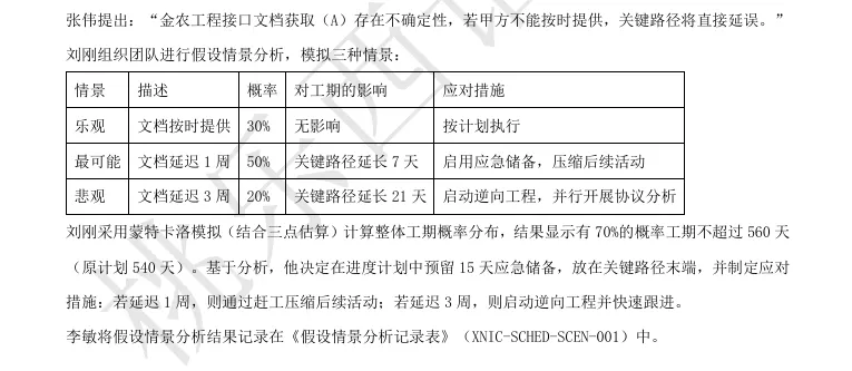 2023年7月,XX省智慧农业农村数字乡村项目完成了活动定义、排序和持续时间估算。项目经理刘刚没有急于在Project软件里排甘特图,而是召集核心团队召开制定进度计划专题会,参会人员包括:架构师张伟、开发组长王磊、测试组长李敏、采购专员王芳,并特邀甲方信息中心李主任。刘刚开场:“今天我们要制定一份真正可行的进度计划,必须考虑资源冲突和不确定性。我们要用假设情景分析来应对风险,用资源优化来平衡负载。”