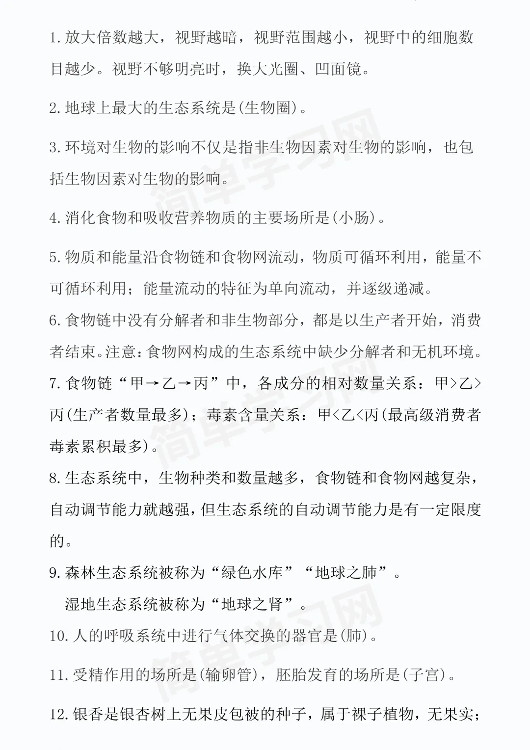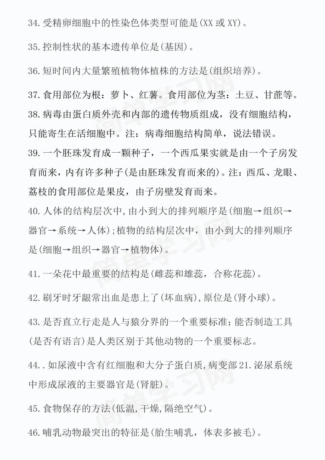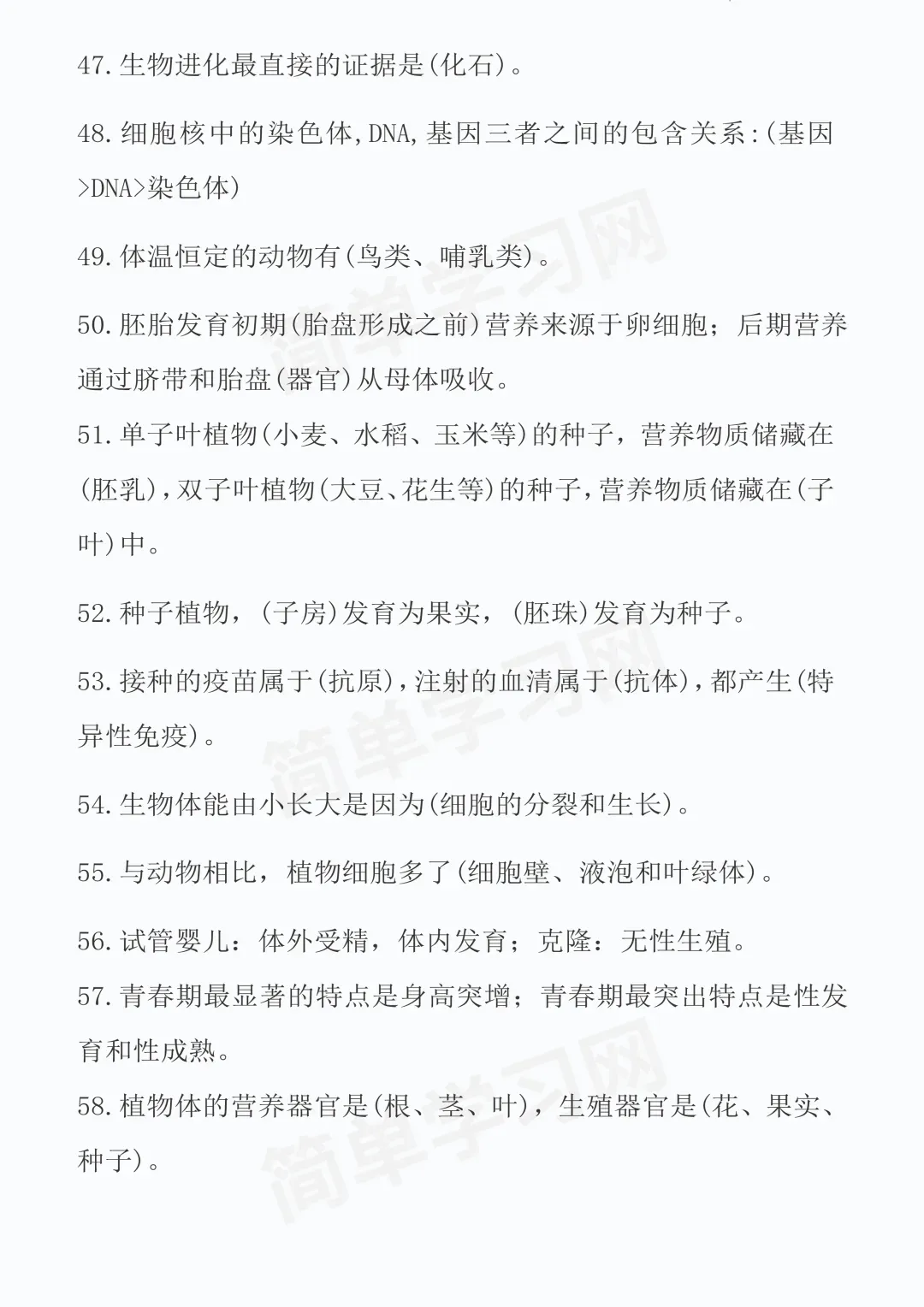 可打印!2026初中生物会考必背!100个易错点知识点总结!