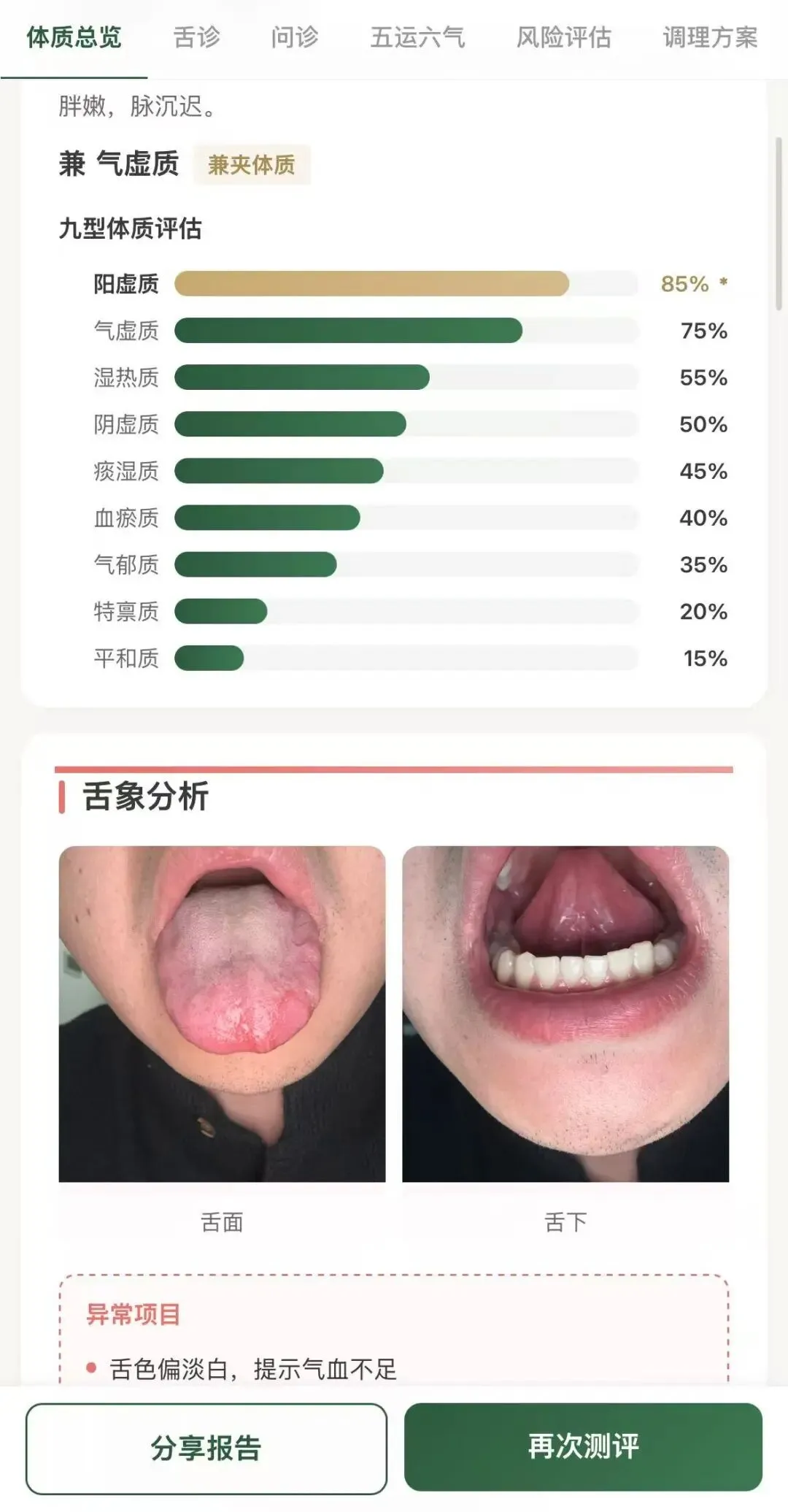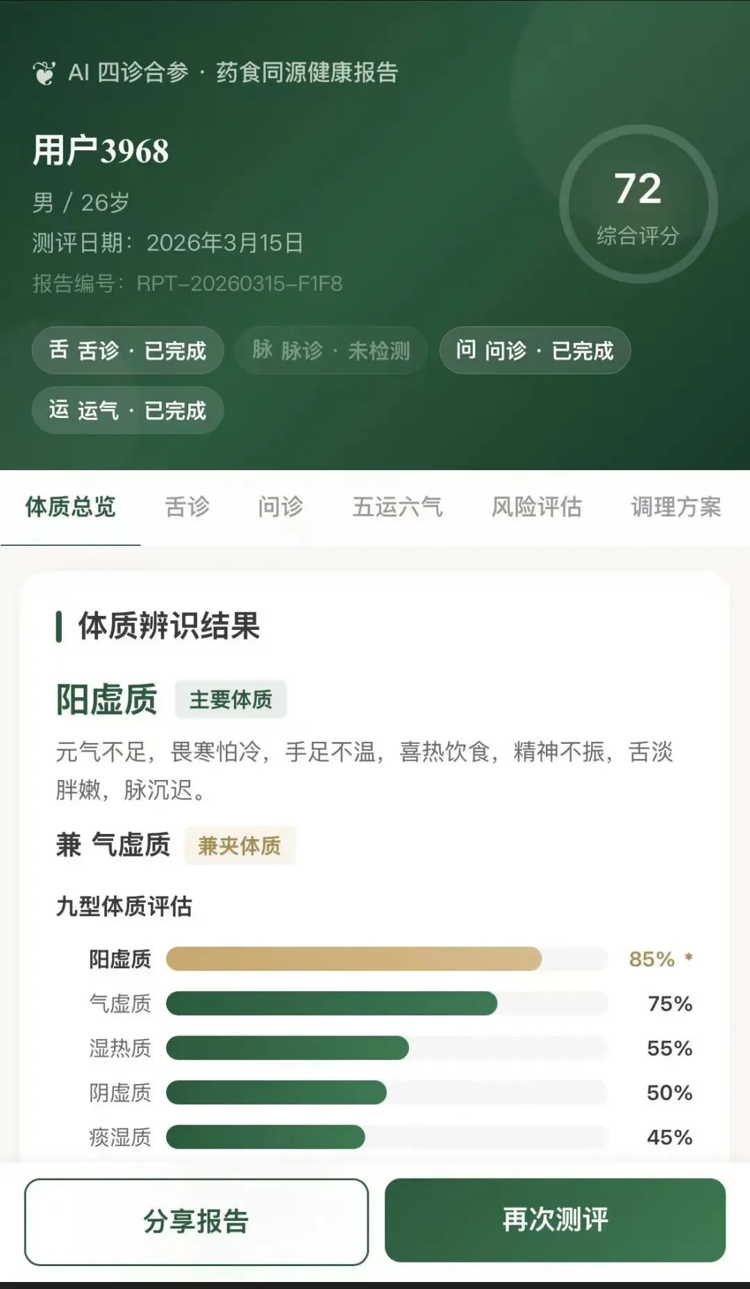 我把流程做成标准的望闻问切的方式:用户先走完舌象/问诊,五运六气等步骤;如果是需要脉诊的版本,我们还接入了脉诊的硬件。用户提交后,我不会立刻给一份草率结果,而是把每一步的内容整合,再生成综合报告,包含体质概览、对应的舌/问诊关键信息、风险提醒、调理建议、日常食疗方向,以及适合的穴位方向。
