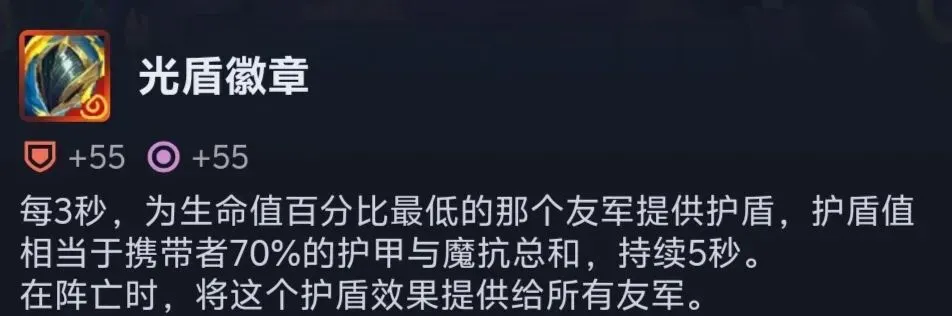 神器光盾徽章提供55的双抗,每3秒给生命值最低的友军提供护盾。护盾值相当于携带者70%的护甲与魔抗总和,持续5秒。阵亡时,护盾会给全体友军套上护盾。下图告诉你,俄洛伊携带光盾几乎就是无敌的存在。