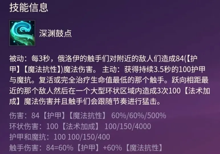 俄洛伊的技能每3秒触手会对附近敌人造成双抗的魔法伤害。主动获得3.5秒的100双抗,并且复活阵亡的触手然后对最近的敌人造成伤害。选择重装羁绊的俄洛伊,8重装提供800护甲100魔抗,算上技能和光盾就是955护甲255魔抗。搭配板甲使用最终护甲可以突破1000、魔抗300+,既能输出又能保护脆皮队友绝对是版本最稳前排。