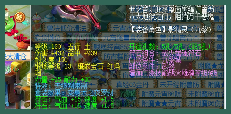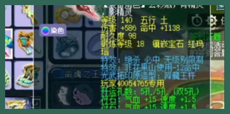 等级130、五行土,面板上可以看到伤害和命中都不低,并且还有力量+15,耐力+30双加加上孔数、符石的效果,整体就是随手翻背包也不简单的感觉。其实也挺符合梦幻老玩家的认知:好的号并不是靠一件装备撑起来的,而是依靠很多细节一起把强度堆满的。