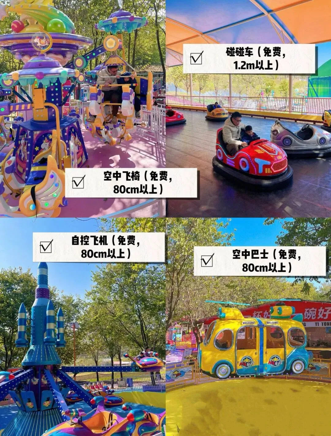滑索区往里走就是“欢乐世界”,藏着N多免费小型机动游戏:旋转木马转得慢悠悠,迷你海盗船晃得幅度小,“小蜜蜂飞船”上下起伏,娃玩得笑不停。最香的是不用排队,玩完一个直接冲下一个,老母亲只需在旁边扶扶安全带,轻松到想哼歌~