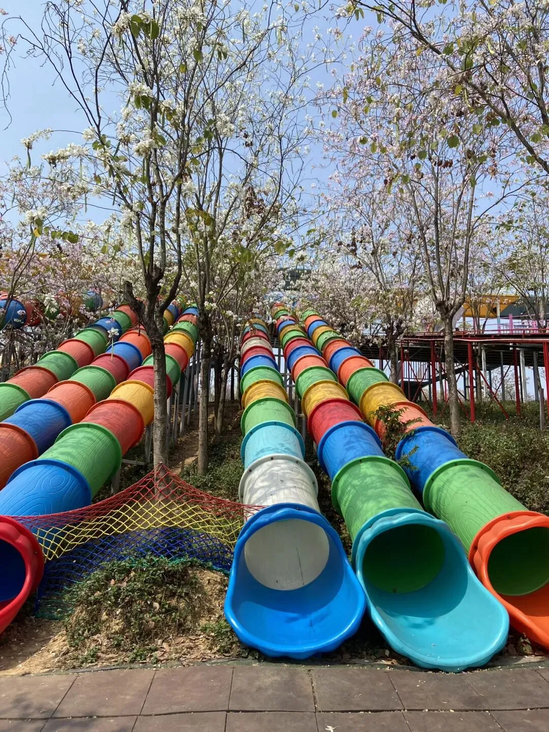 从山顶下来能看到彩虹滑道,红橙黄绿赛道超吸睛,低龄娃虽然不能玩,但站旁边看大孩子“嗖”地冲下来,娃也跟着拍手;