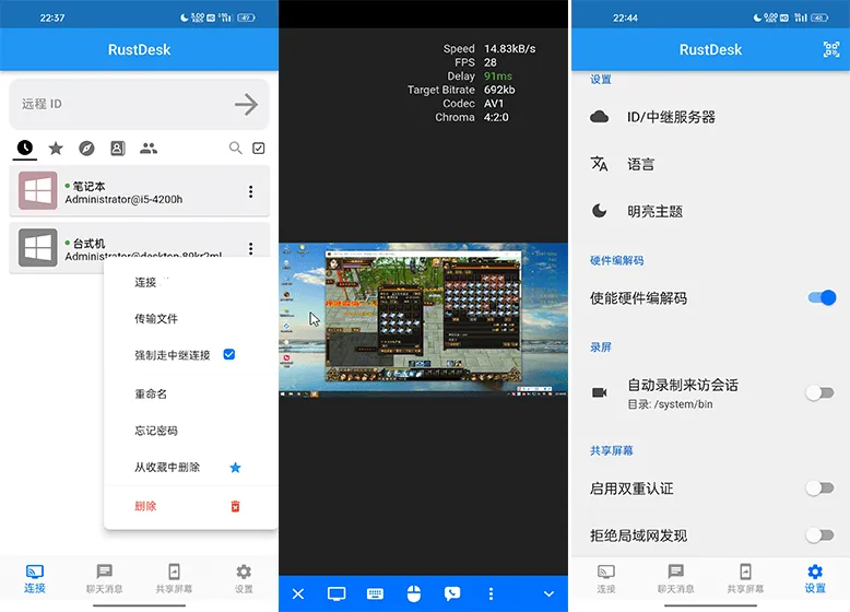 RustDesk for Android 开源免费跨平台的远程桌面控制软件,可替代ToDesk,TeamViewer、向日葵、微软远程桌面、AnyDesk 等软件,RustDesk 开源虚拟与远程桌面基础架构,远程桌面软件,开箱即用,无需任何配置。您完全掌控数据,不用担心安全问题。您可以使用我们的注册/中继服务器,或者可自建远程控制服务器,亦或者开发您的版本来远程控制你的计算机。如果想找一款“免费开源”的远程控制软件来替代 ToDesk,老牌的TeamViewer、向日葵、微软远程桌面、AnyDesk 这些商业软件,RustDesk 正是一个好选择!它完全免费可商用、跨平台、功能丰富不限速,甚至你还能自建中继服务器,不必担心安全和网速问题!可以说是解决了大家对远控软件的很多痛点。