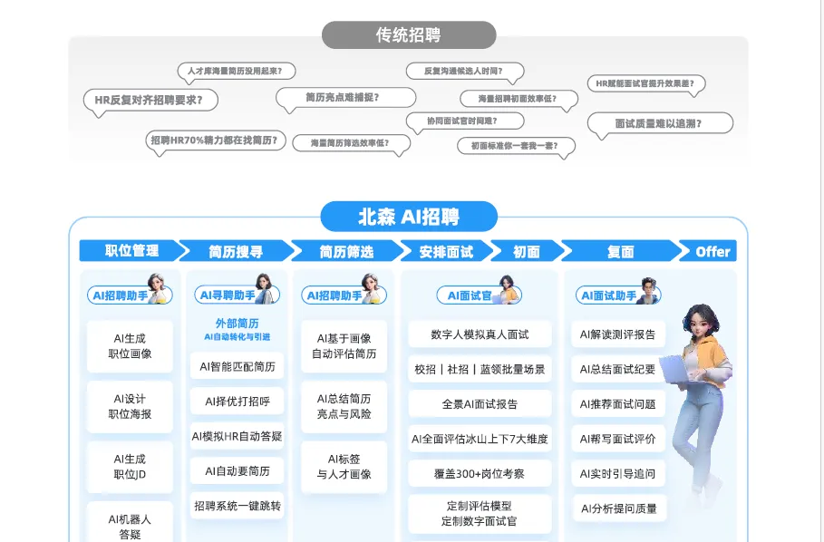 第一类,北森这类的HR Saas系统公司,目前有AI招聘和AI面试官两个产品,AI招聘主要功能是搜索简历,AI面试官则是通过面试做候选人评估。AI招聘不单独售卖,而是绑定北森的SaaS系统一起使用,原因很简单——它的搜索是基于北森的人才库,即企业已经通过自购的招聘网站权益存到系统里的简历。有企业用了北森的AI招聘,反馈并不好用,说是不够聪明,而且经常掉线,毕竟它最主要的功能是筛简历,而不是主动去触达候选人并跟候选人对话(当然,可以接外呼系统对候选人进行外呼)。