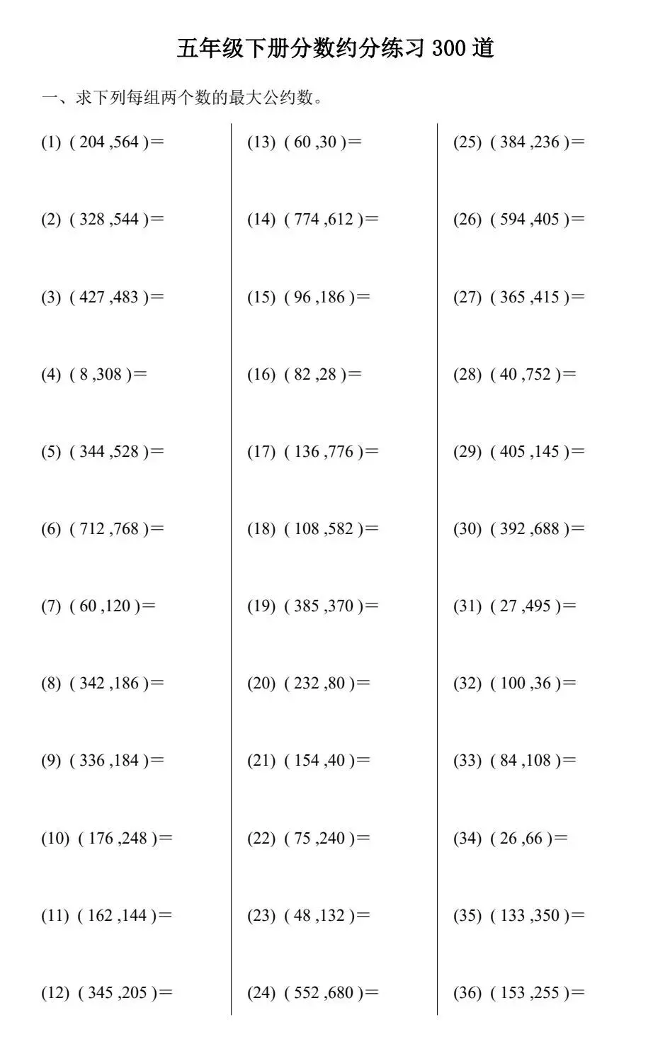 26春五下数学《分数约分练习300道》电子版
