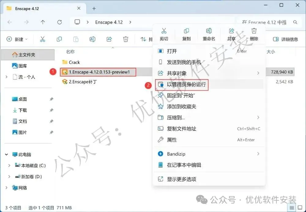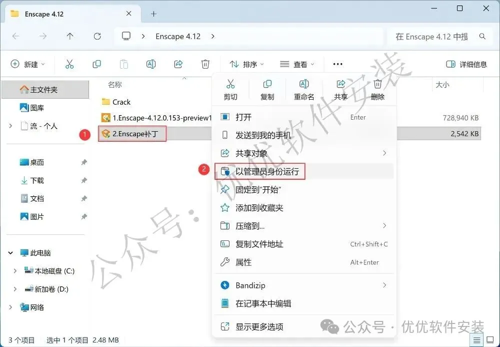 9、回到Enscape 4.12文件夹,找到【Enscape补丁】应用程序,右键选择【以管理员身份运行】它