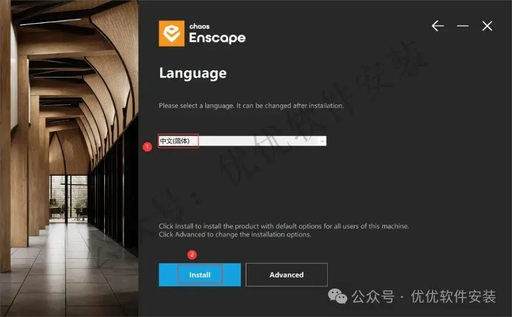 5、Language选择:中文简体,再点击【Install】