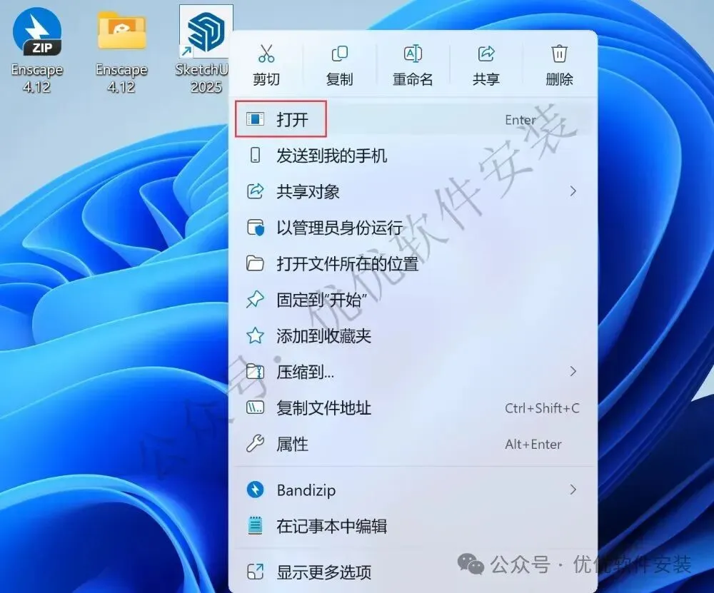 12、回到桌面,右键桌面上的【SketchUp 2025软件图标】,点击【打开】
