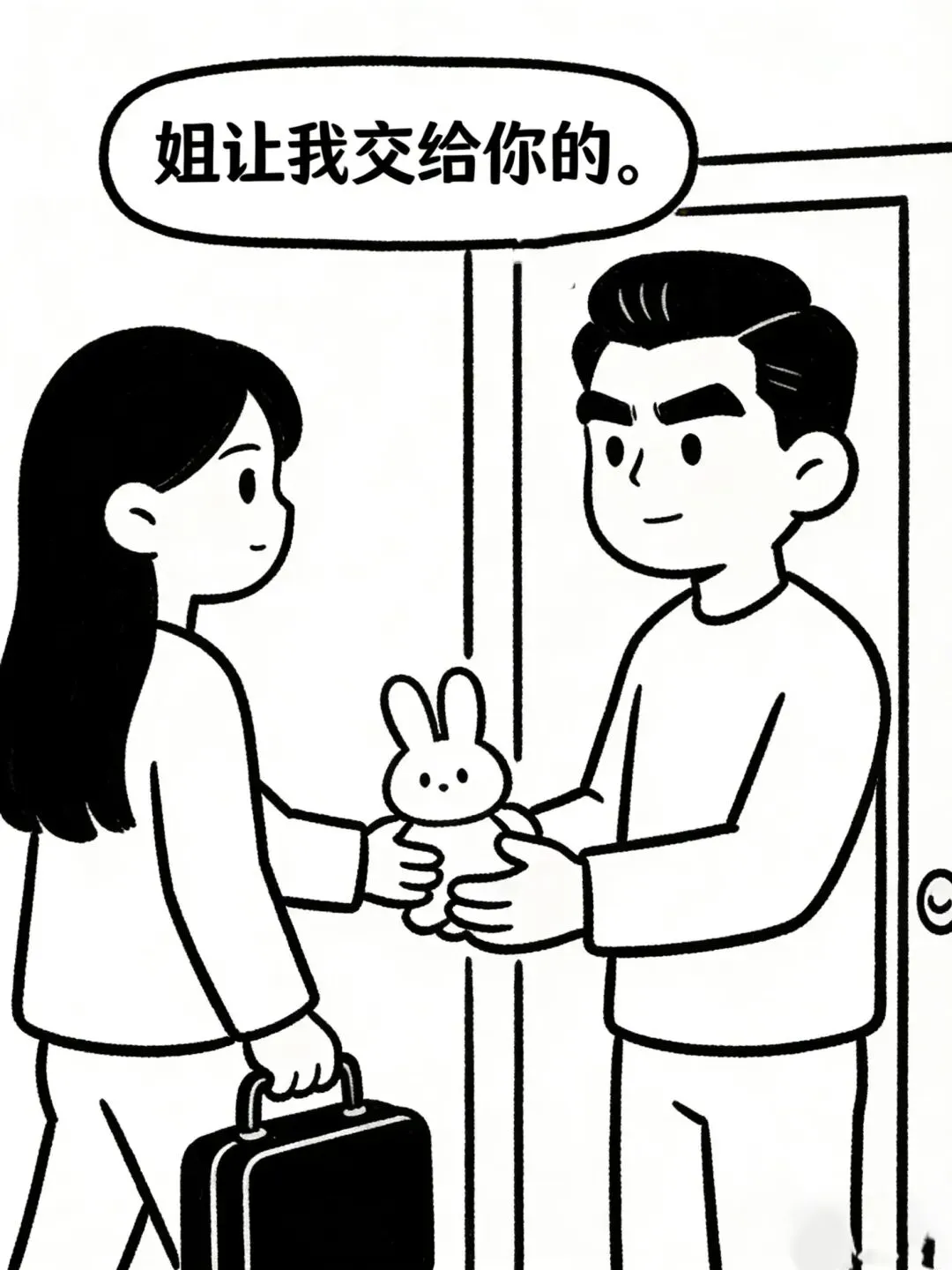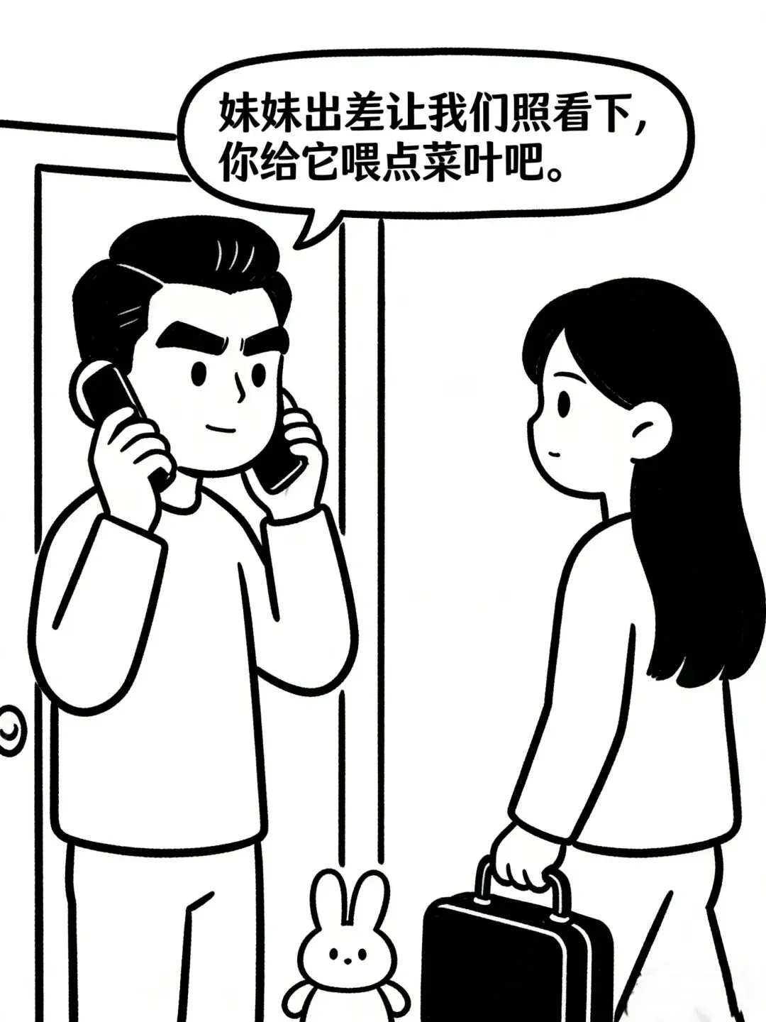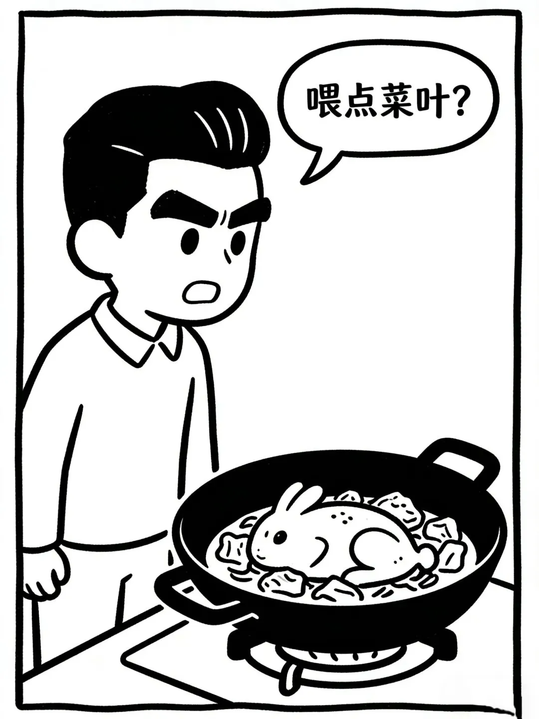 趣味漫画:送兔子 早上,小姨子上门递给我一只兔子:“姐让我交给你的。”说完提着行李箱匆匆离开。十一点,老婆从单位打来电话:“兔子收到了?”我:“嗯。”老婆:“妹妹出差让我们照看下,你给它喂点菜叶吧。”喂点菜叶?望着锅里的红烧兔肉我陷入了沉思。然后我往里面又加了点香菜•