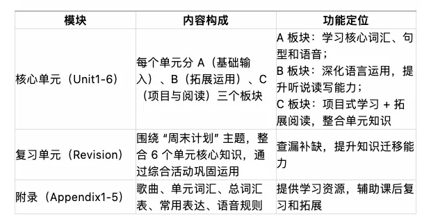 本教材遵循《义务教育英语课程标准(2022 年版)》要求,以 “话题为纲、功能为目、任务驱动” 为设计理念,共分为 6 个单元和 1 个复习单元,附录包含歌曲、词汇表、常用表达、语音等辅助资源,整体结构清晰,层层递进。