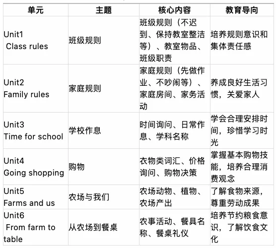 教材主题紧密围绕学生生活实际,涵盖 “规则养成、时间管理、生活技能、自然与食物” 四大核心领域,具有较强的实用性和教育意义: