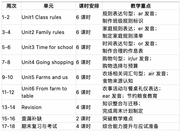 语音:每个单元聚焦 1 个重点字母组合发音,共 6 个:ar(farm, car)、er(brother, ruler)、or(horse, fork)、ir/ur(bird, skirt, hurt)、air(chair, hair)、ear(bear, pear),通过歌谣、仿写、朗读巩固发音规则。 -