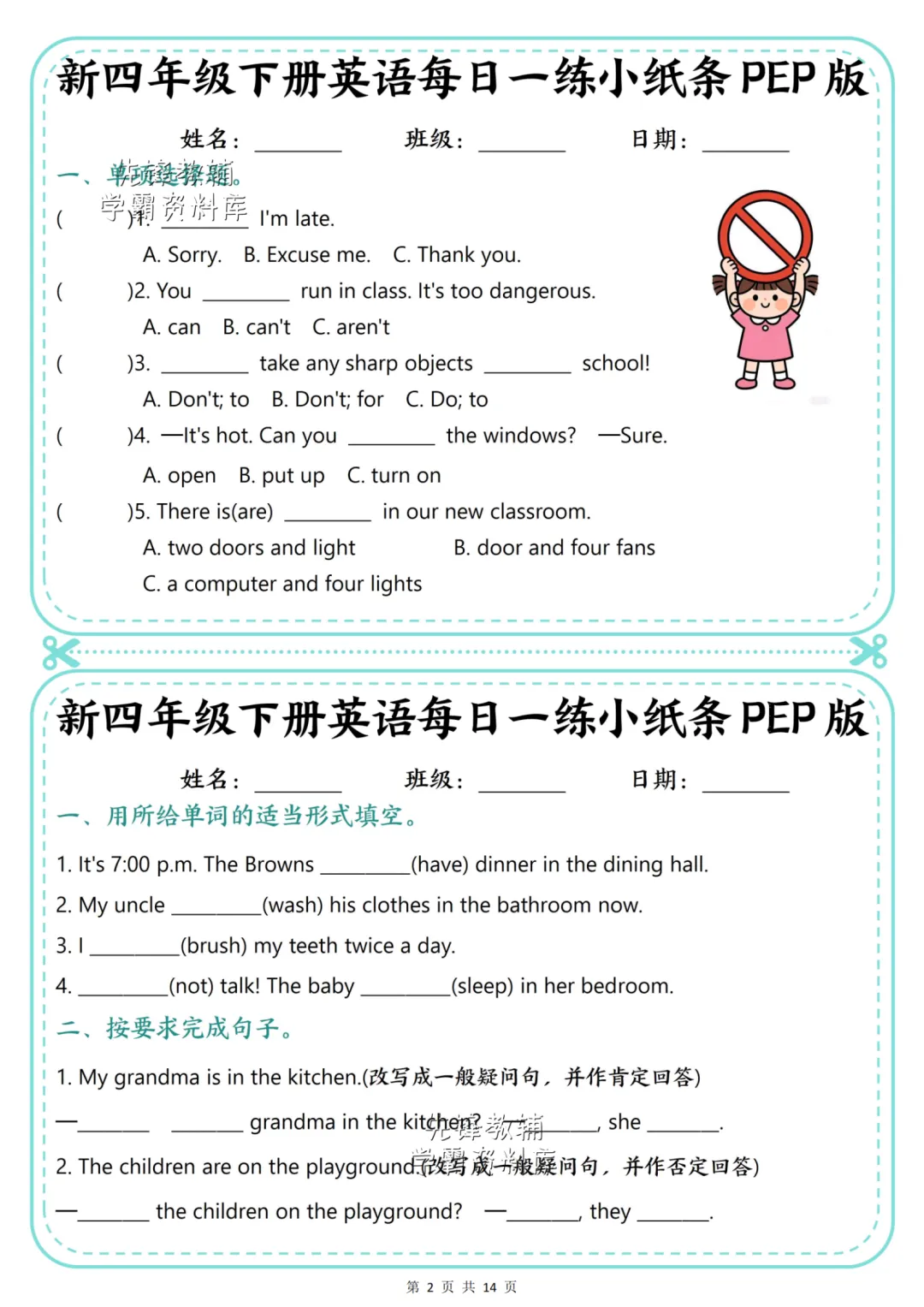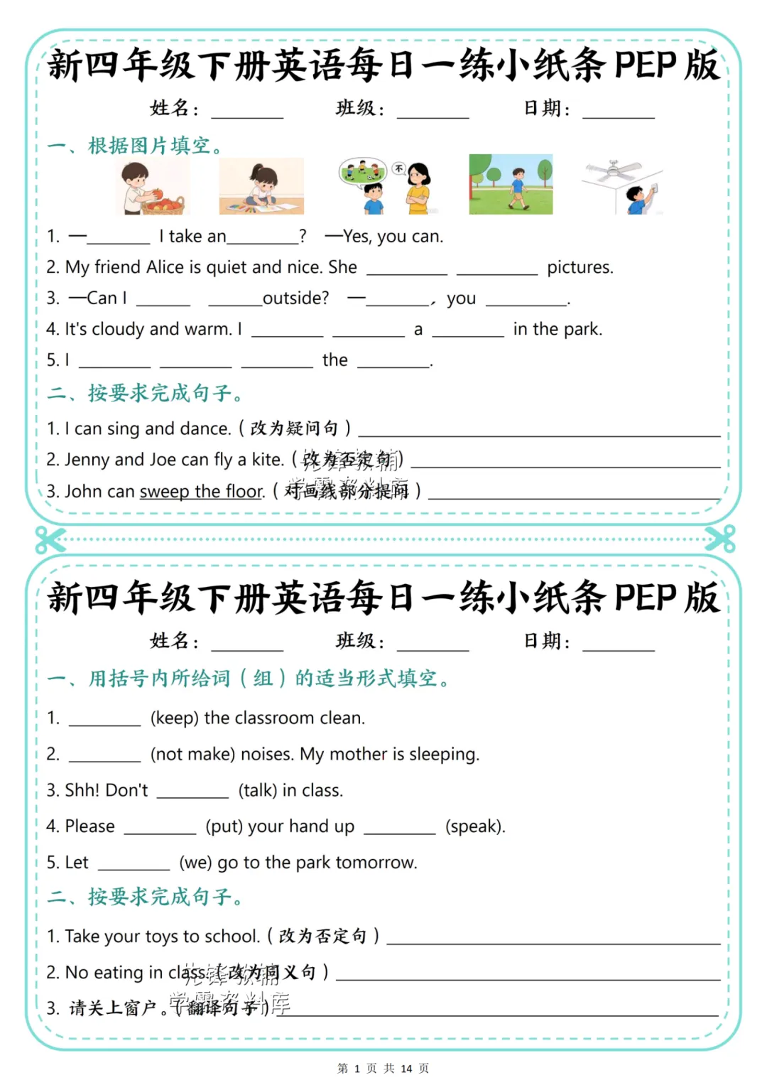 这份小纸条紧扣课本核心知识点,从情景看图填空到句型转换,再到动词形式运用,层层递进帮孩子夯实基础。既能练习情态动词can的用法,又能巩固祈使句的肯定与否定形式,还有实用的情景对话和汉译英练习。
