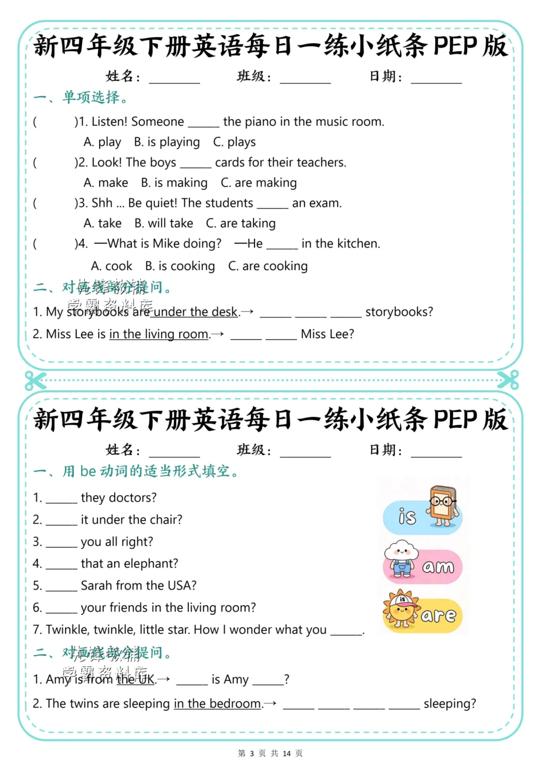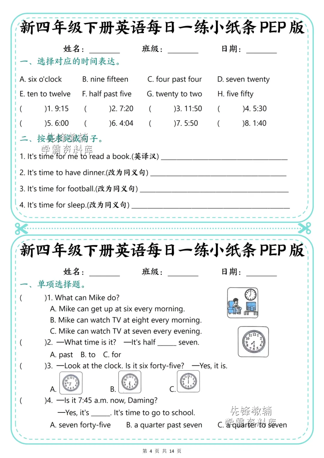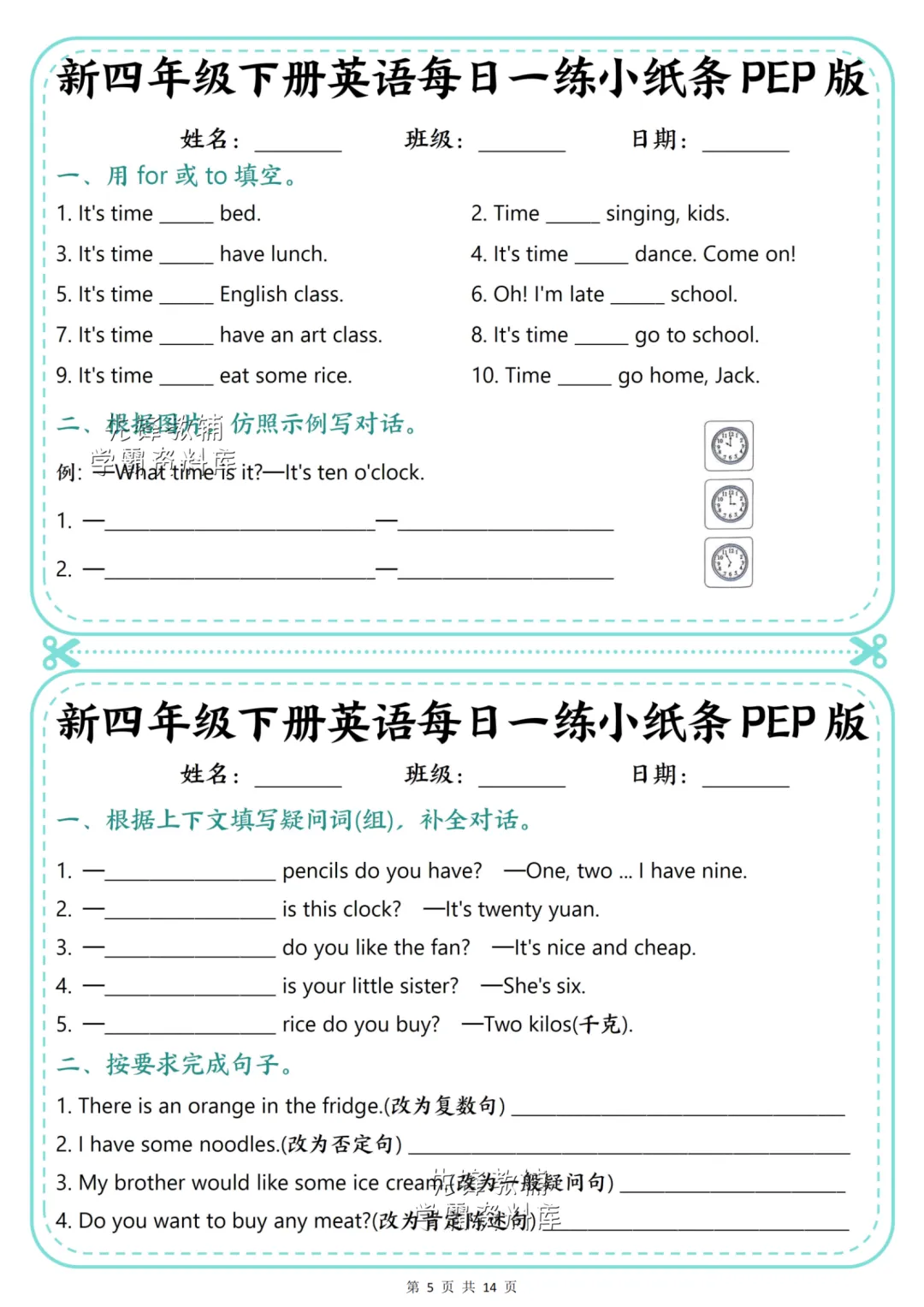 26年四年级下册英语【每日一练小纸条】(电子版PDF可打印)