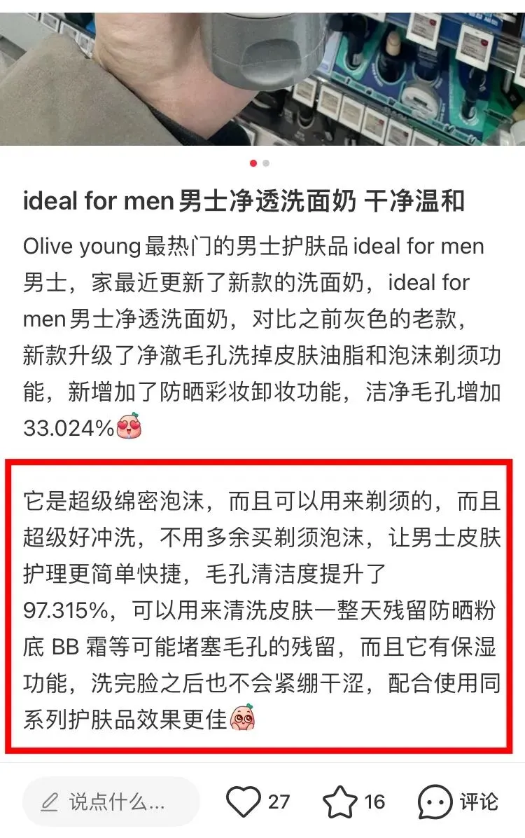 Ideal专门做男士产品,Olive young男士排行第一,洗的干净,有去黑头的效果,也不会脸绷绷的