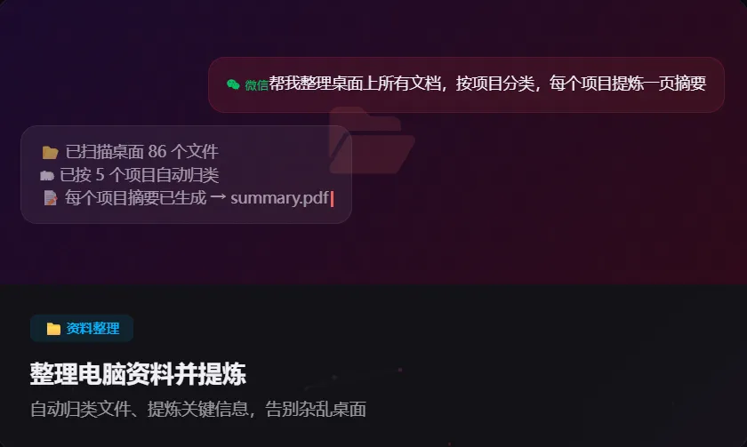 说实话很惊喜。首先是不用学代码,这点对小白非常友好并且界面也比较直观,基本一看就知道怎么用。微信远程操控这个功能,用习惯了真的爽。你在路上就能指挥家里的电脑干活。隐私方面也放心,数据都在本地不用担心被谁拿去训练模型。当然也有不足的地方,多任务处理有点卡。不过日常用用问题不大,毕竟咱们一般也不会同时让它干多个活儿。
