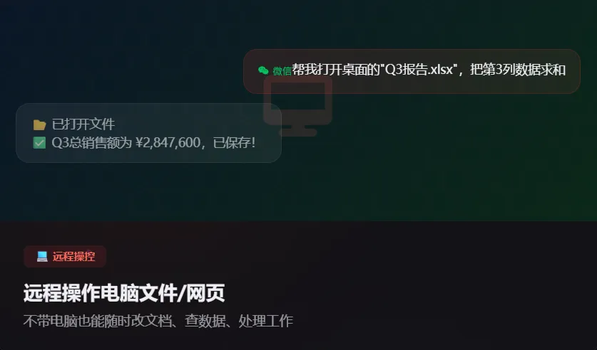 比如说你上班突然想起来,有个文件放家里电脑了。以前你可能得回家,或者找家里人帮忙开电脑。而现在只需要微信发条消息,让 QClaw 帮你找到文件、发到你邮箱。