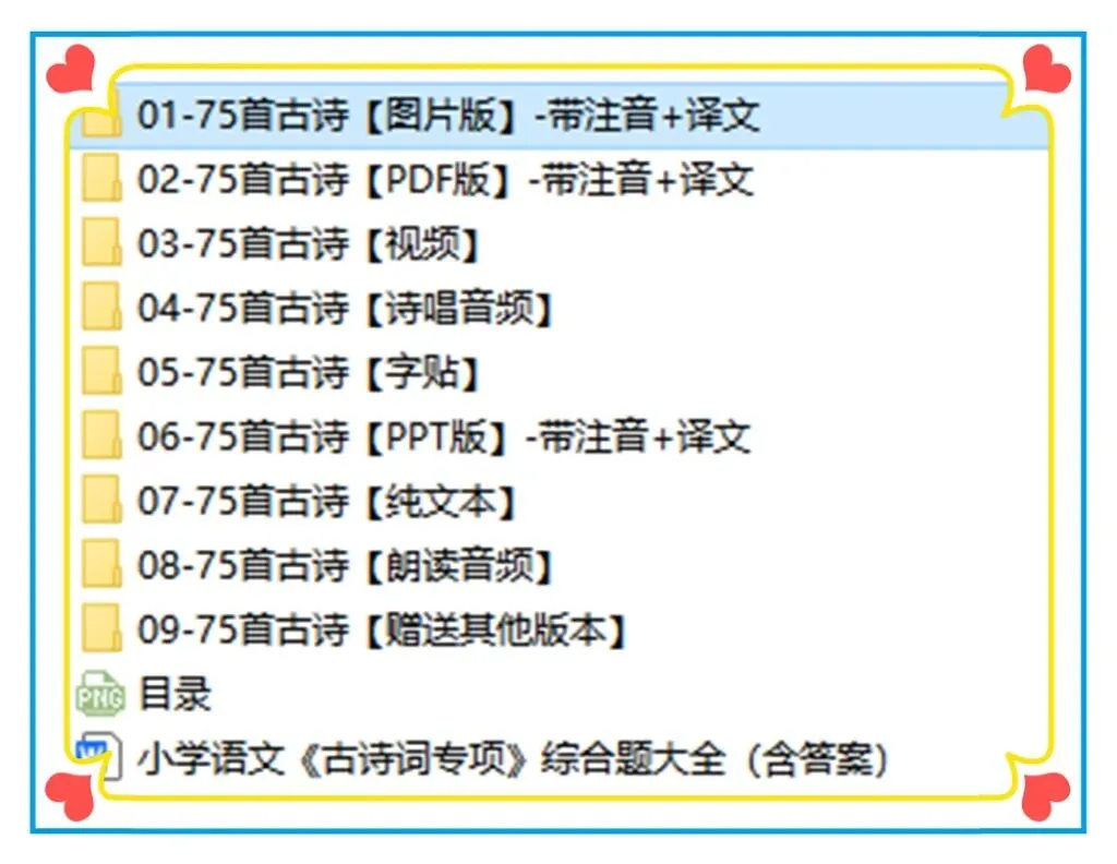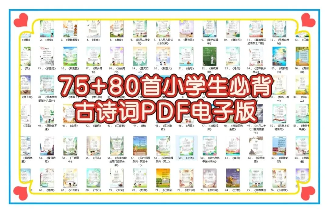 这里有新课标75首+新大纲80首小学生必背古诗词,不仅有带拼音和词语注释的PDF电子文档,可直接打印 ,还有配套视频音频,帮助孩子理解记忆,朗诵磨耳朵!