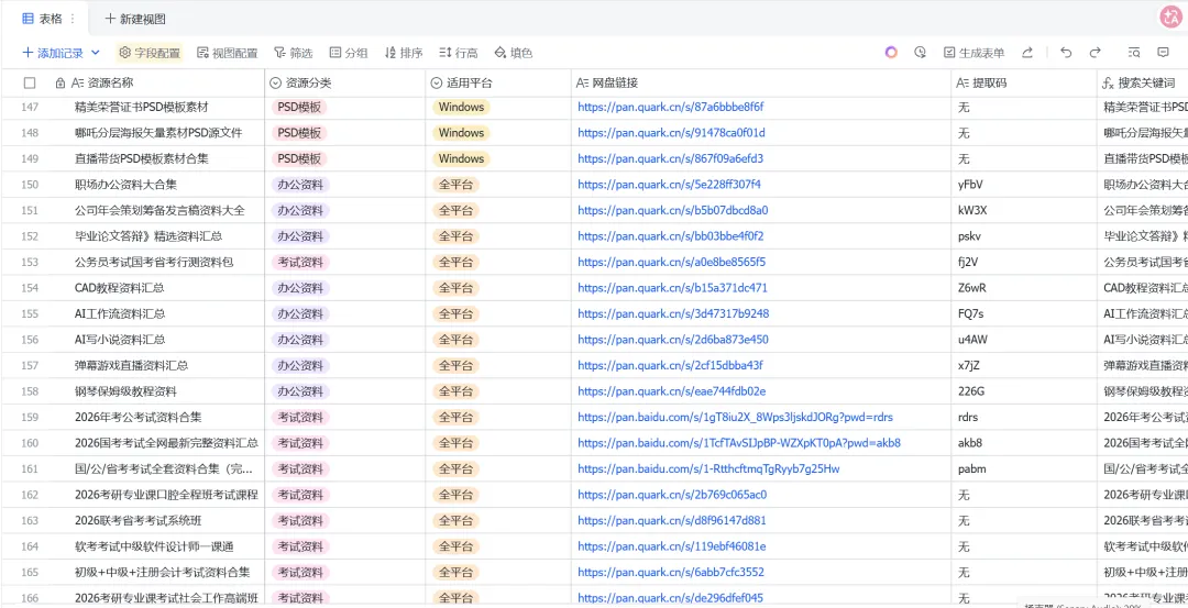 除了做了资源分类外,还给这个资源快捷搜索页加了搜索关键词字段,用公式把资源名称、分类、平台都拼在了一起,目的只是为了让大家找资源的时候尽量能一键精准匹配到所需资源。