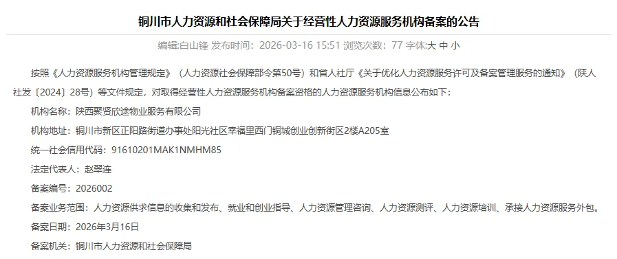 按照《人力资源服务机构管理规定》(人力资源社会保障部令第 50 号)和省人社厅《关于优化人力资源服务许可及备案管理服务的通知》(陕人社发〔 2024 〕28 号)等文件规定,对取得经营性人力资源服务机构备案资格的人力资源服务机构信息公布如下: