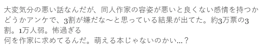 比如曾有日本网友组织过一场相关投票,问人们是否对相貌平平的同人志画师抱有负面情绪。