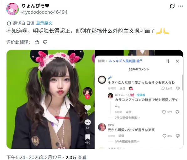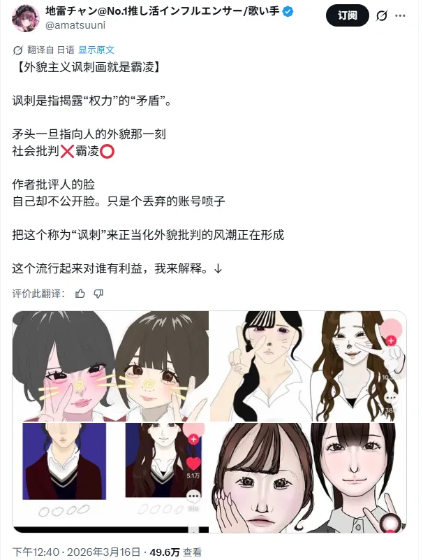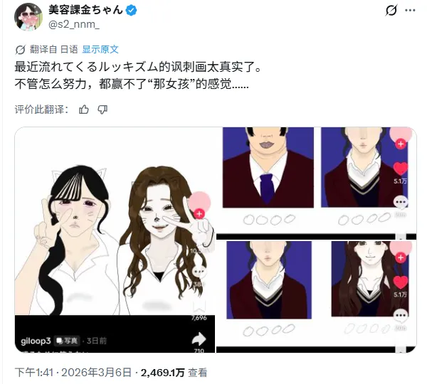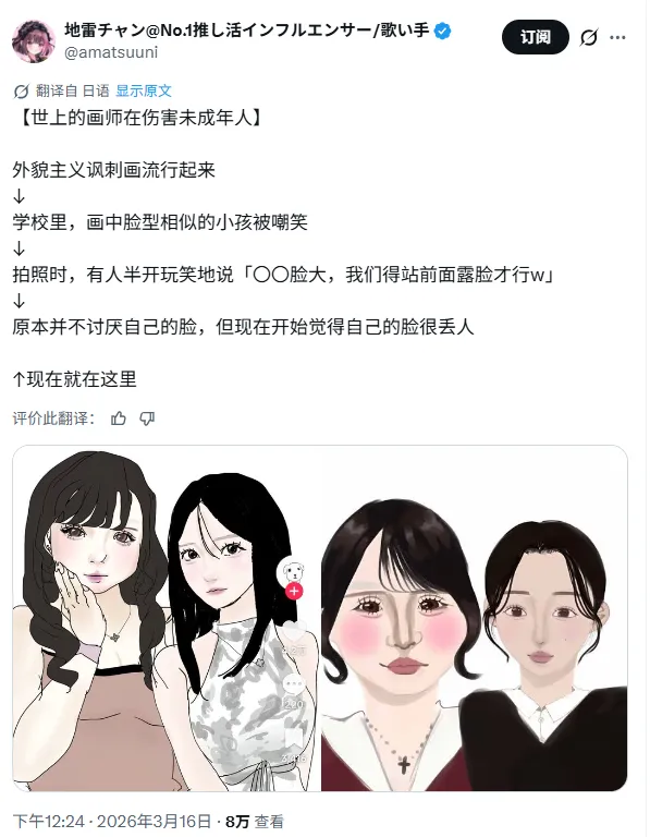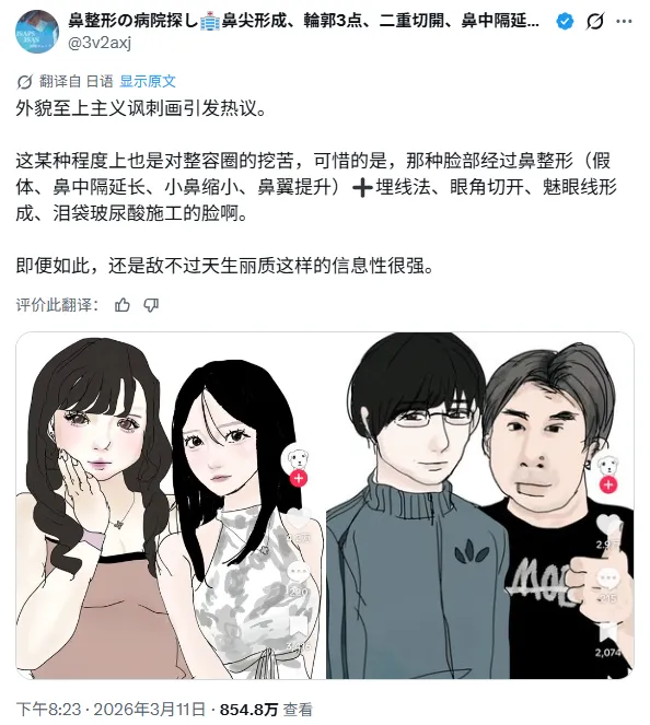 人们把这种漫画称作“外貌主义讽刺漫画”,最出圈的作品浏览量已经超过250万,而X上的相关评论贴的热度更是直接达到了2460万。