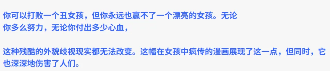 ——即便说同样的话,但如果你长得漂亮就会得到赞美,不符合他人审美就会遭到批评。