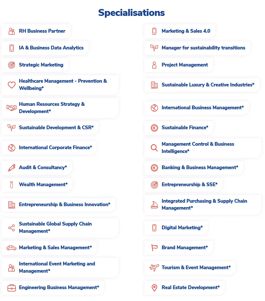 本校双学位:管理学硕士项目提供28种专业,其中有24个专业可获得Excelia管理学硕士(MGE)和理学硕士(MSc)双学位。