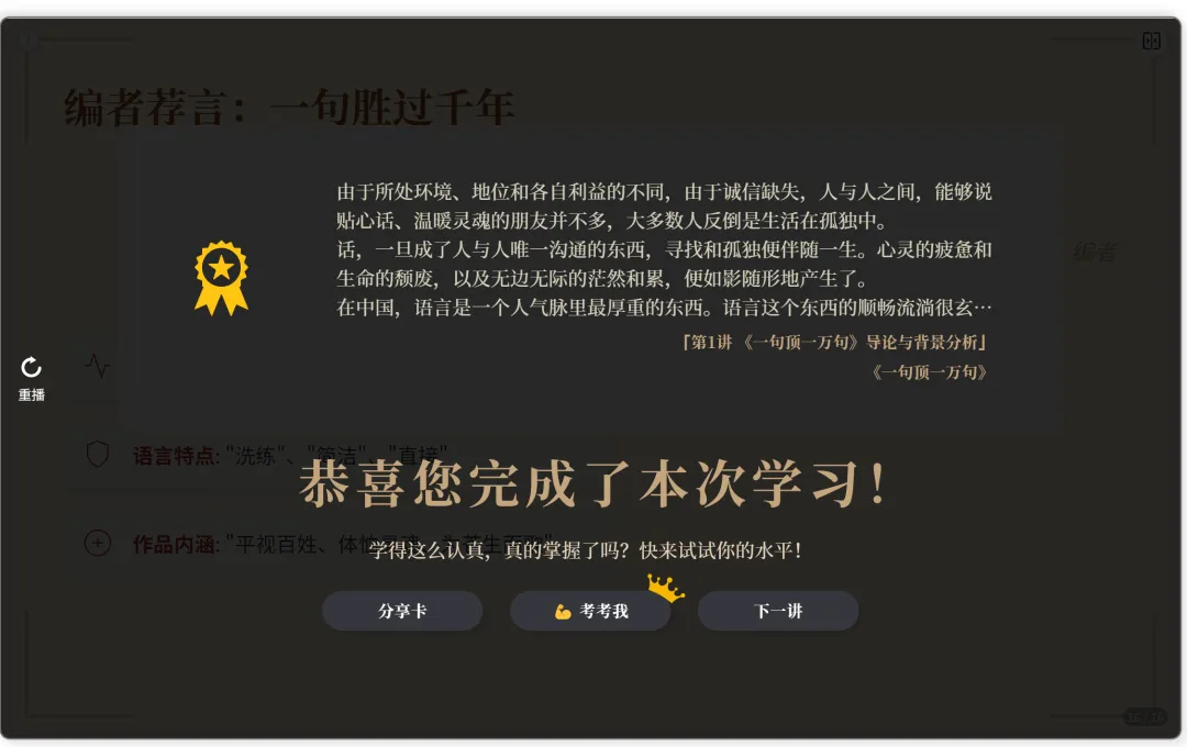 推荐中还包含了刘震云的《一句顶一万句》,试听了几集,每集结束后都有阶段性总结,可生成试题自测,也可直接跳转下一讲,支持一键分享。