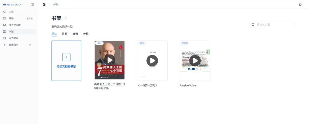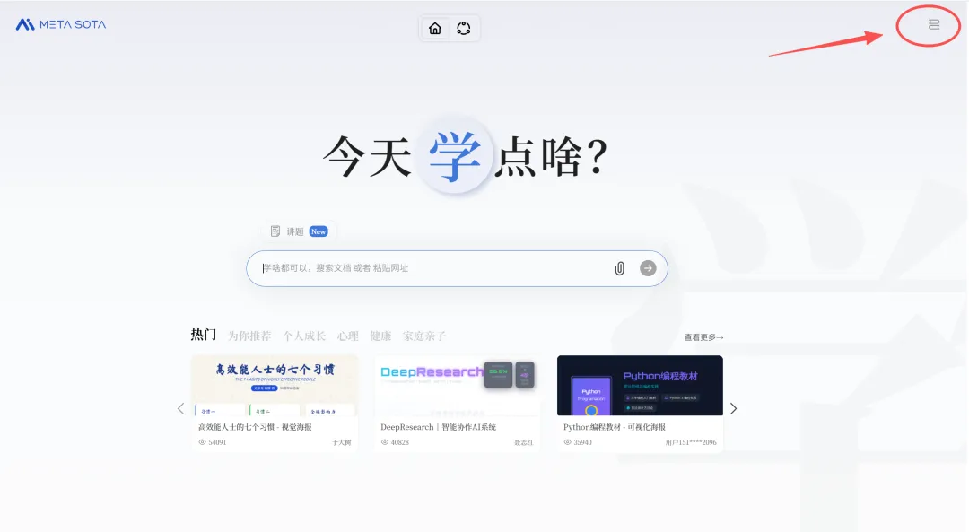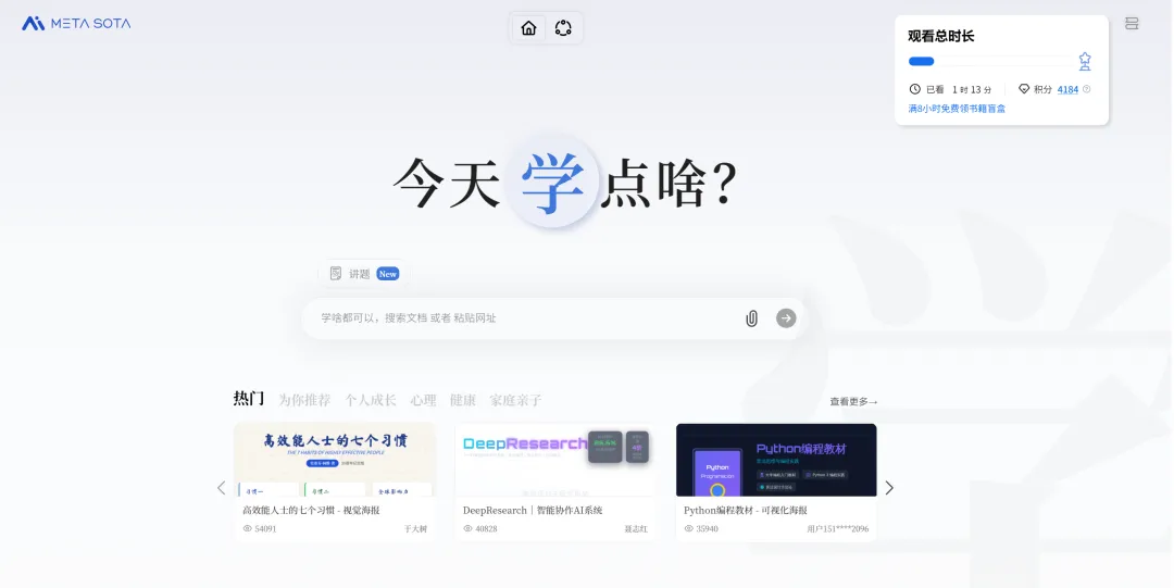 顺着页面指引,来到了「今天学点啥」首页。看到热门推荐,其中包含《高效能人士的七个习惯》排在第一。(特别说明,以上文字均由秘塔回响语音输入生成,它可自动识别书名号与标点,并去除说话中的口语词如“啊”“嗯”等,完成语言梳理与精简。)