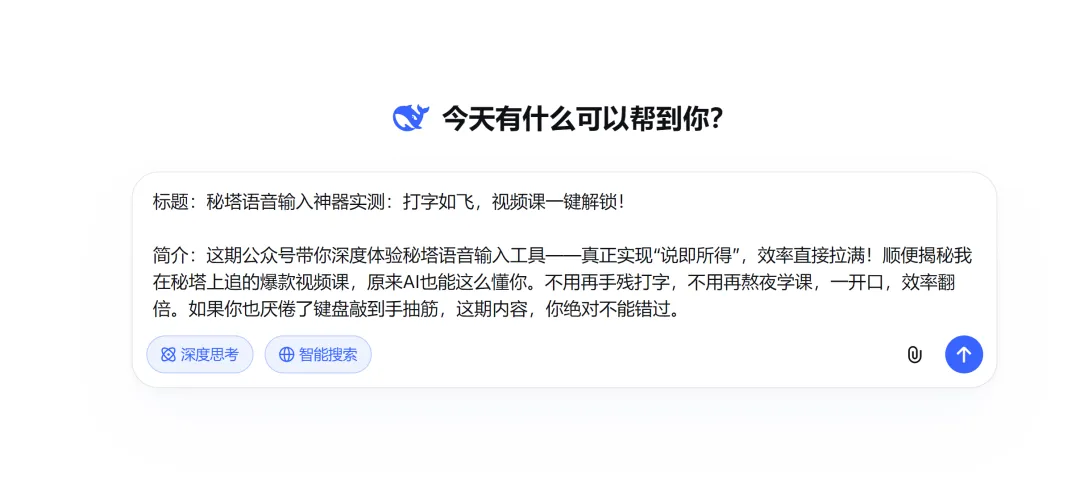 本来打算用秘塔回响语音输入功能,让 DeepSeek 帮我生成今天的公众号简介和标题,没想到输入完后,秘塔已经自动把我的话梳理成了理想的结果,那就直接用这段吧,DeepSeek 拜拜啦。