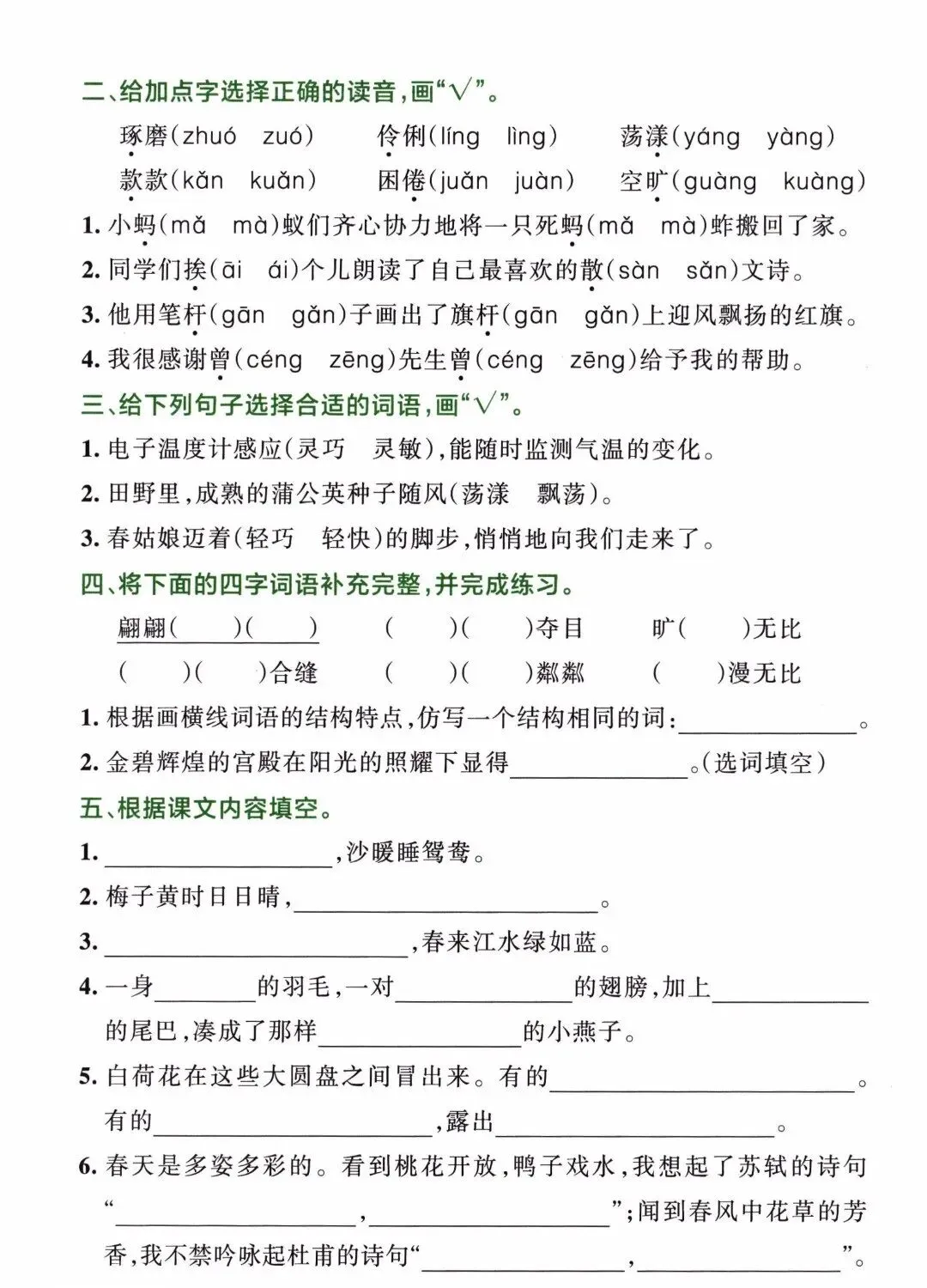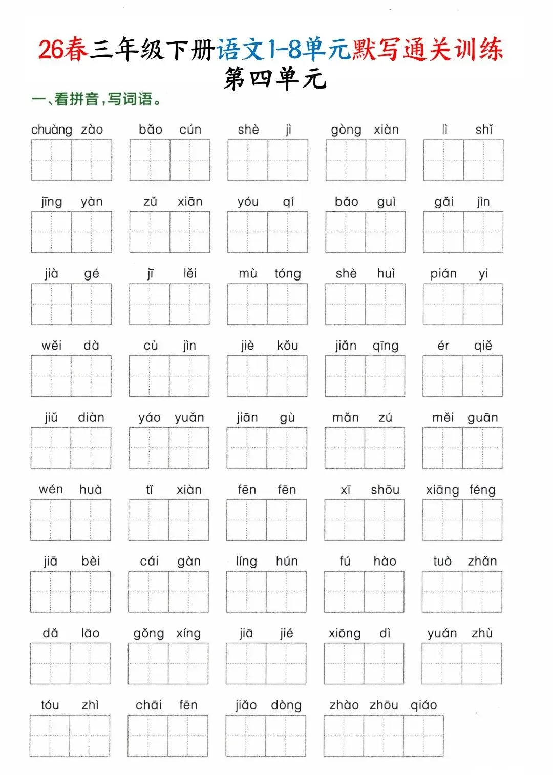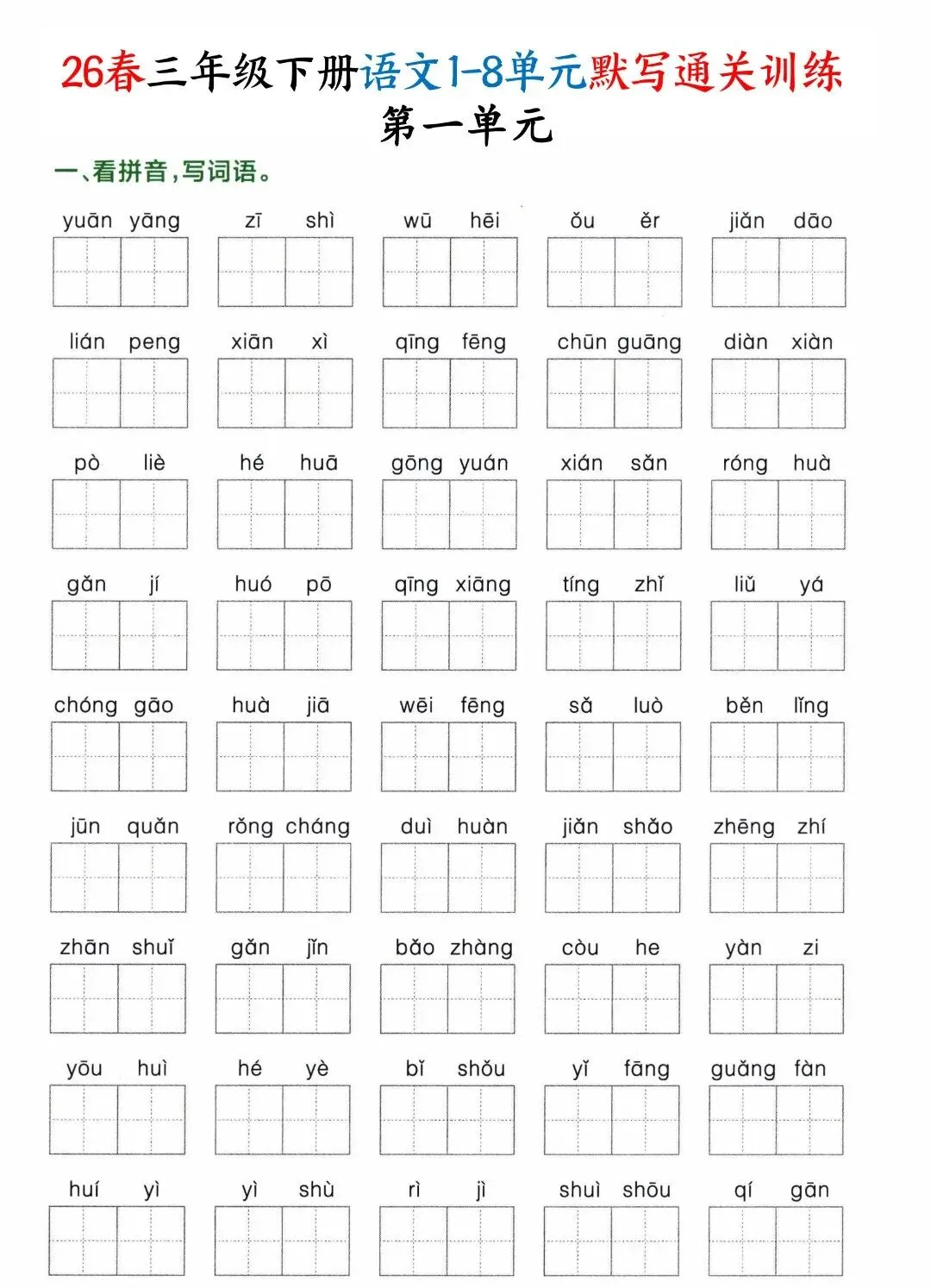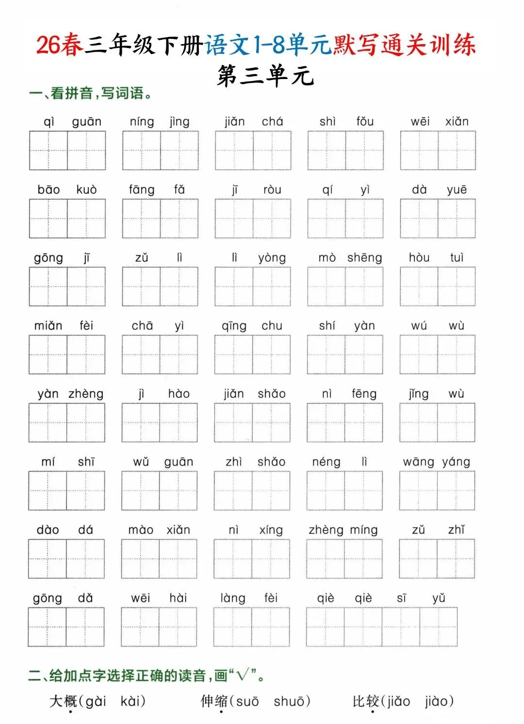 26年春人教新版三年级下册语文1-8单元默写通关训练,含答案共32页,电子版可下载可打印,这份三下语文单元默写专项练习题,涵盖了:看拼音写词语、选择正确的读音、词语补充、按课文内容填空等内容,让孩子在练习中强化所学知识,提升语文学习水平。需要的家长抓紧打印出来,让孩子练一练,写一写吧。