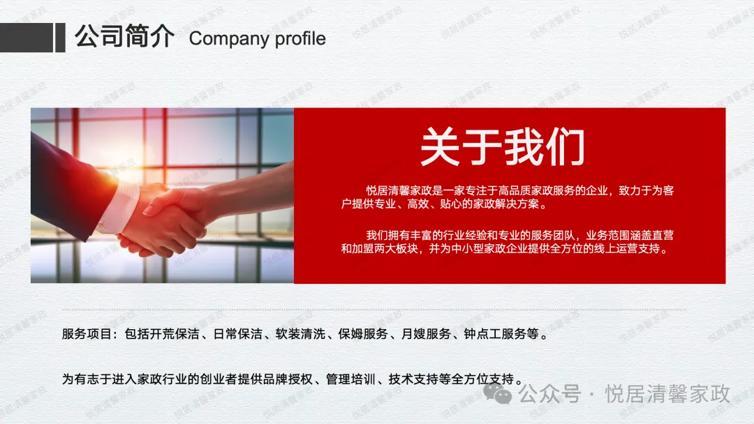 提供一站式 家庭保洁、开荒、家电清洗、地暖清洁,社区维修,人员培训、鞋衣、养护保养等社区服务。