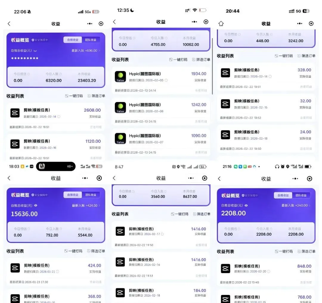 下面是在一起的收益,,包括醒图拉新(目前我们新增海外拉新了)、小云雀拉新、剪映模板拉新、即梦拉新等应用效果,目前还是主做剪映模板,收益稳定,做了就有结果,前期我们推荐也是做剪映模板