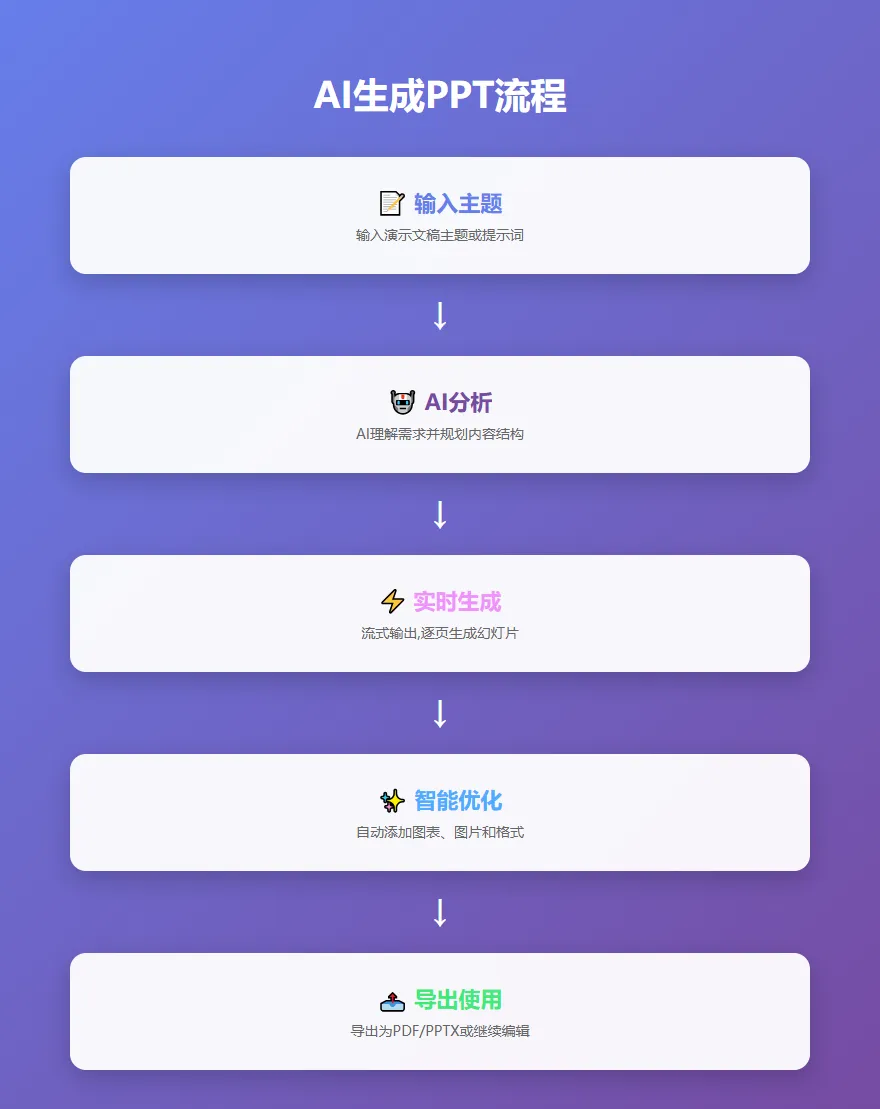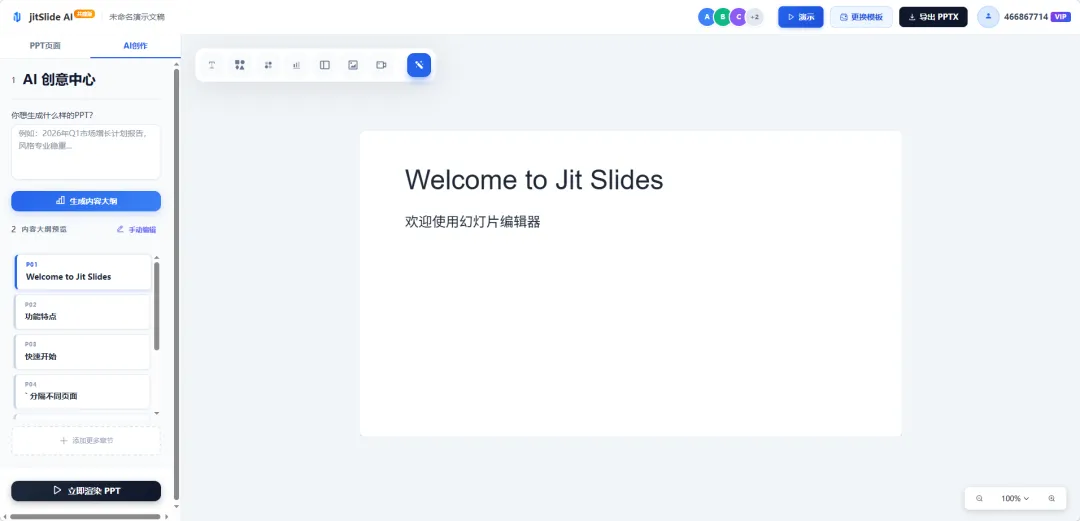 这是最核心的功能!你只需要输入一个主题或提示词,AI就会自动生成完整的演示文稿,而且支持实时流式输出,你可以看到AI一步步生成内容的过程。