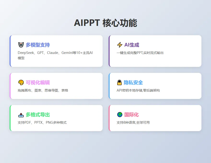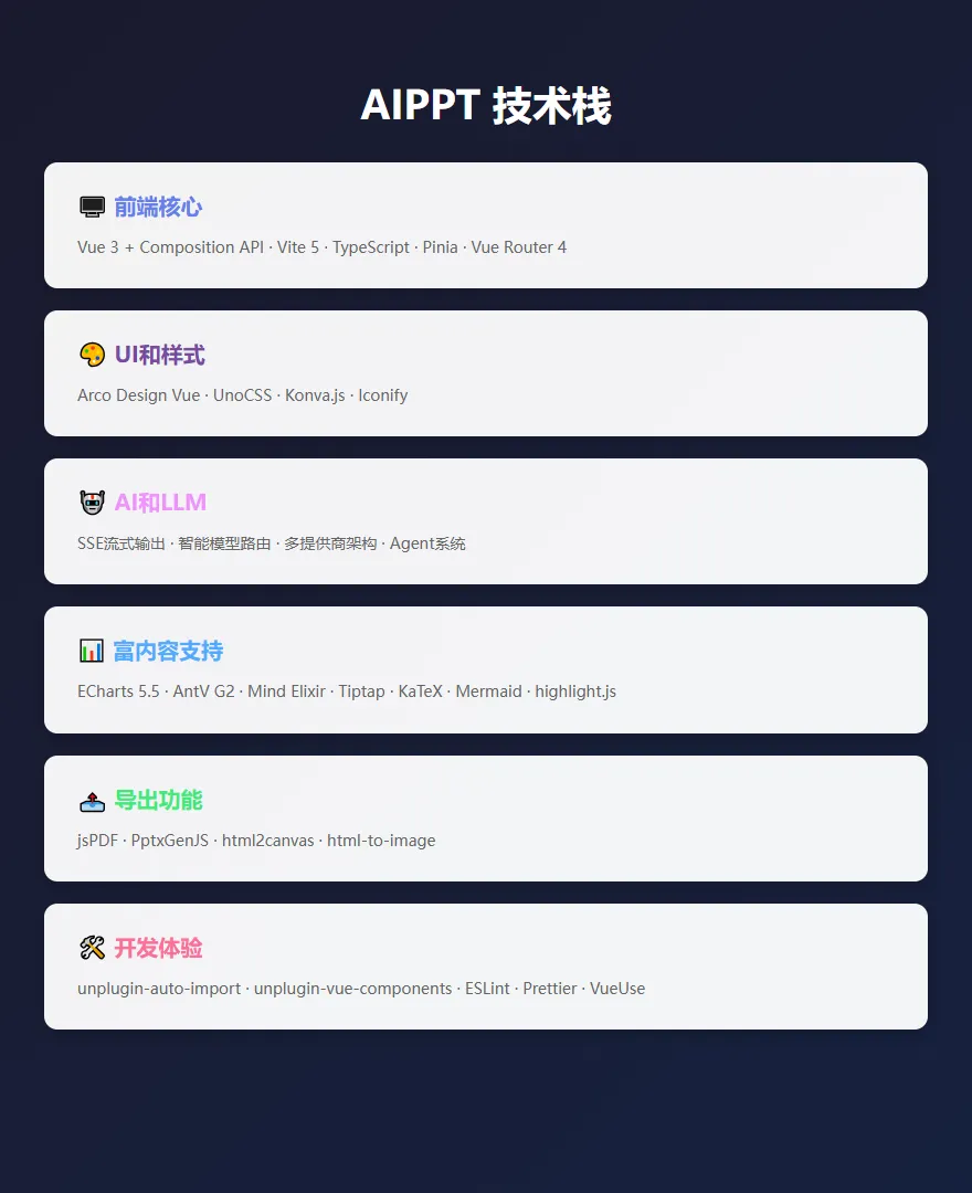 AIPPT是一个基于Vue3和AI技术构建的智能演示文稿编辑器。它最大的特点就是零后端,所有的AI处理都在浏览器中完成,你的API密钥只存储在本地,非常安全。