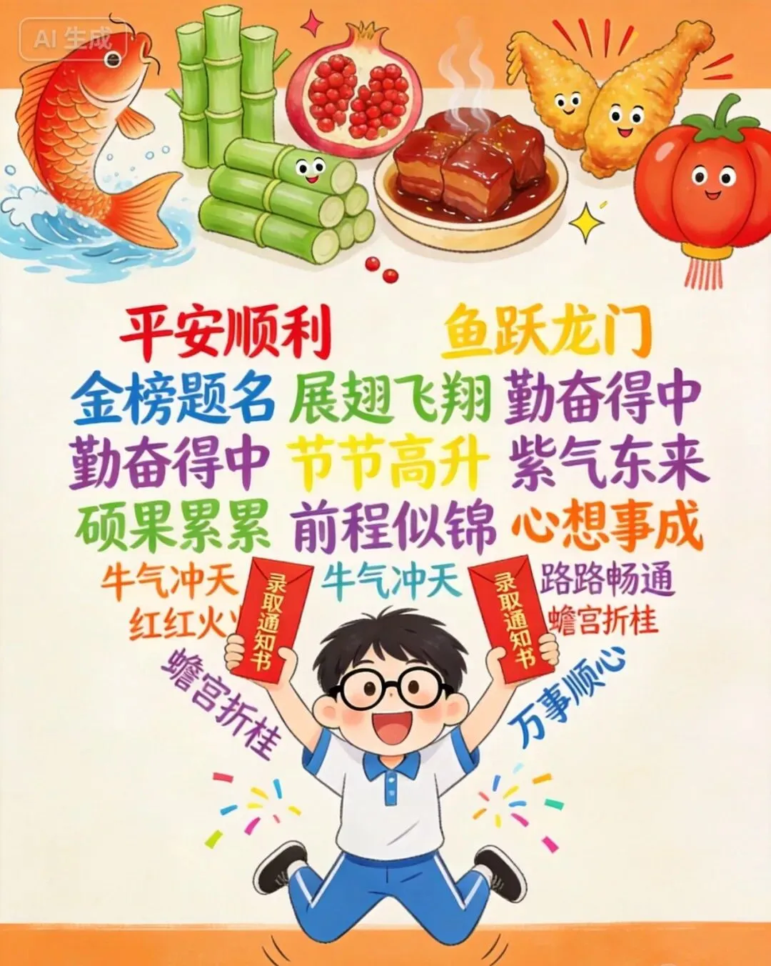 平安顺利+鱼跃龙门+金榜题名+展翅飞翔+勤奋得中+节节高升+紫气东来+硕果累累+前程似锦+心想事成+牛气冲天+路路畅通+红红火火+蟾宫折桂+万事顺心